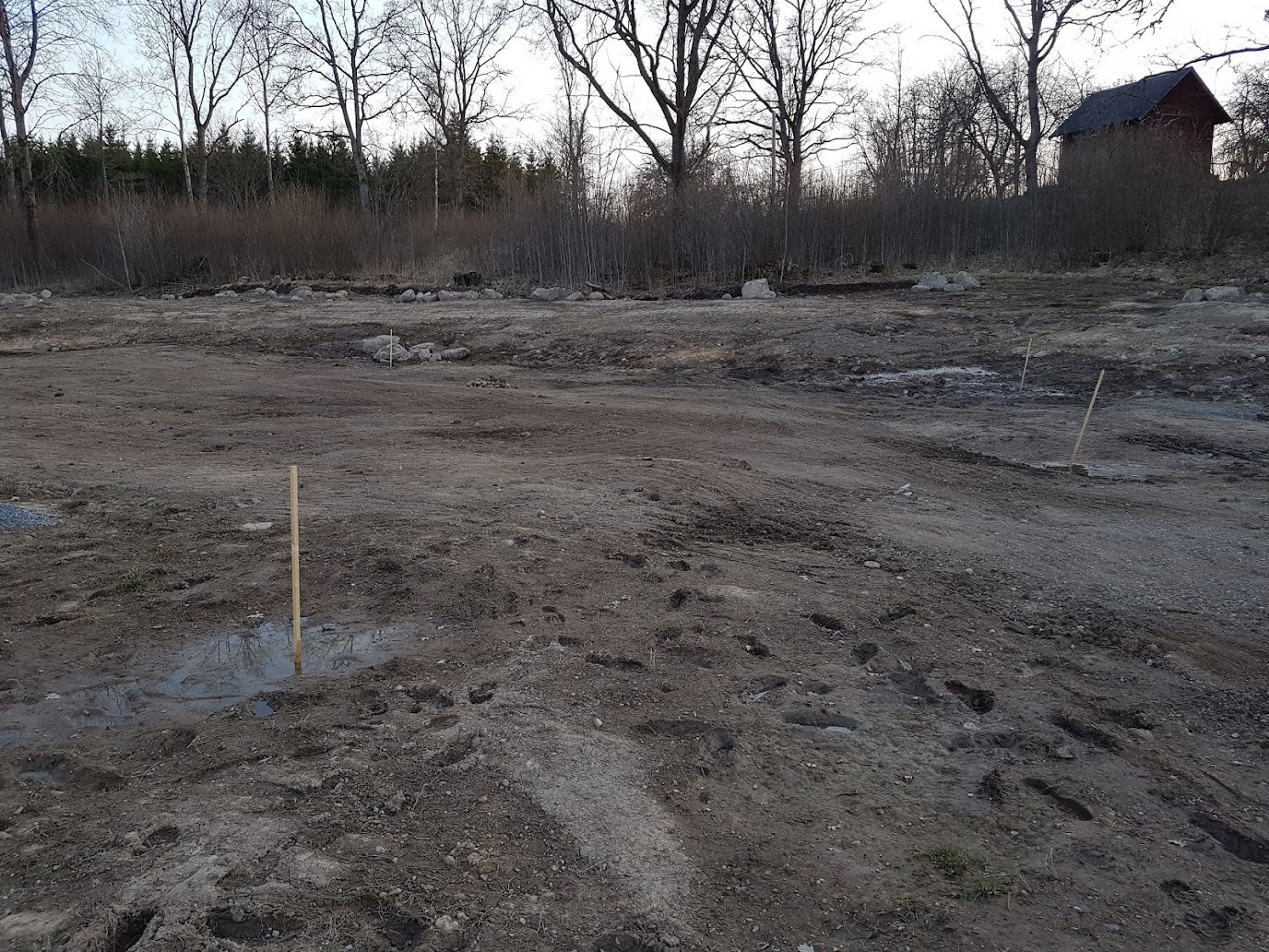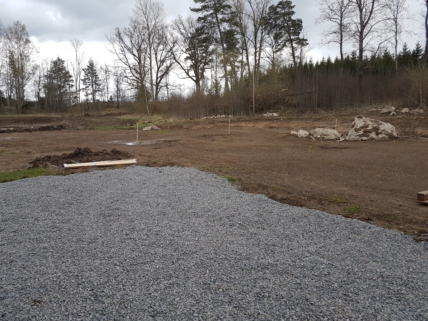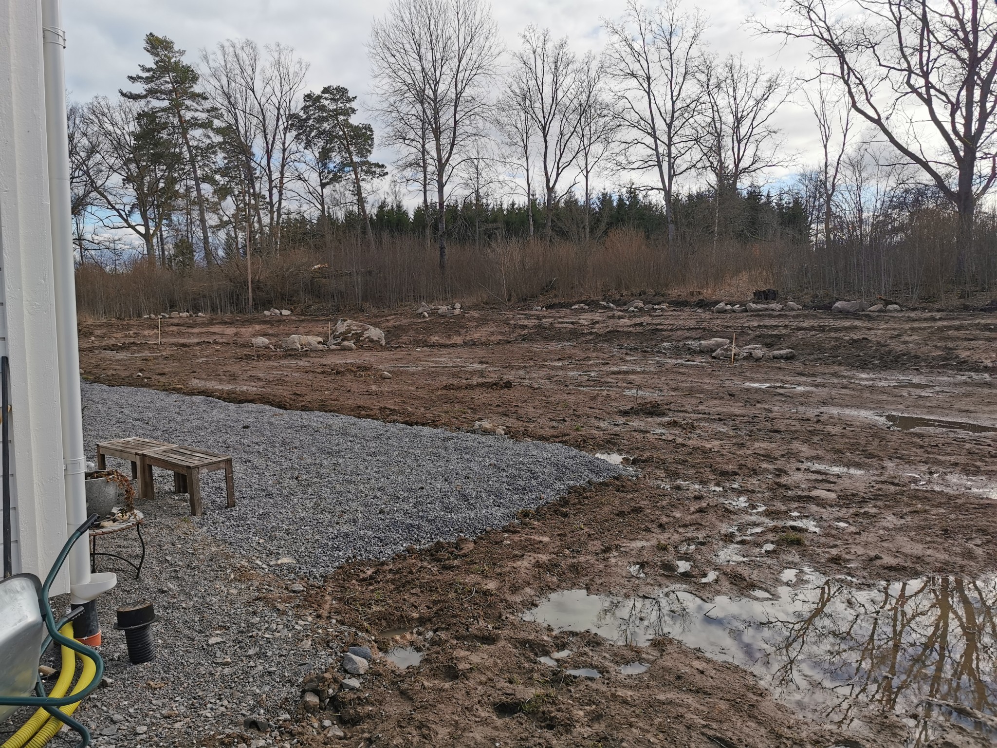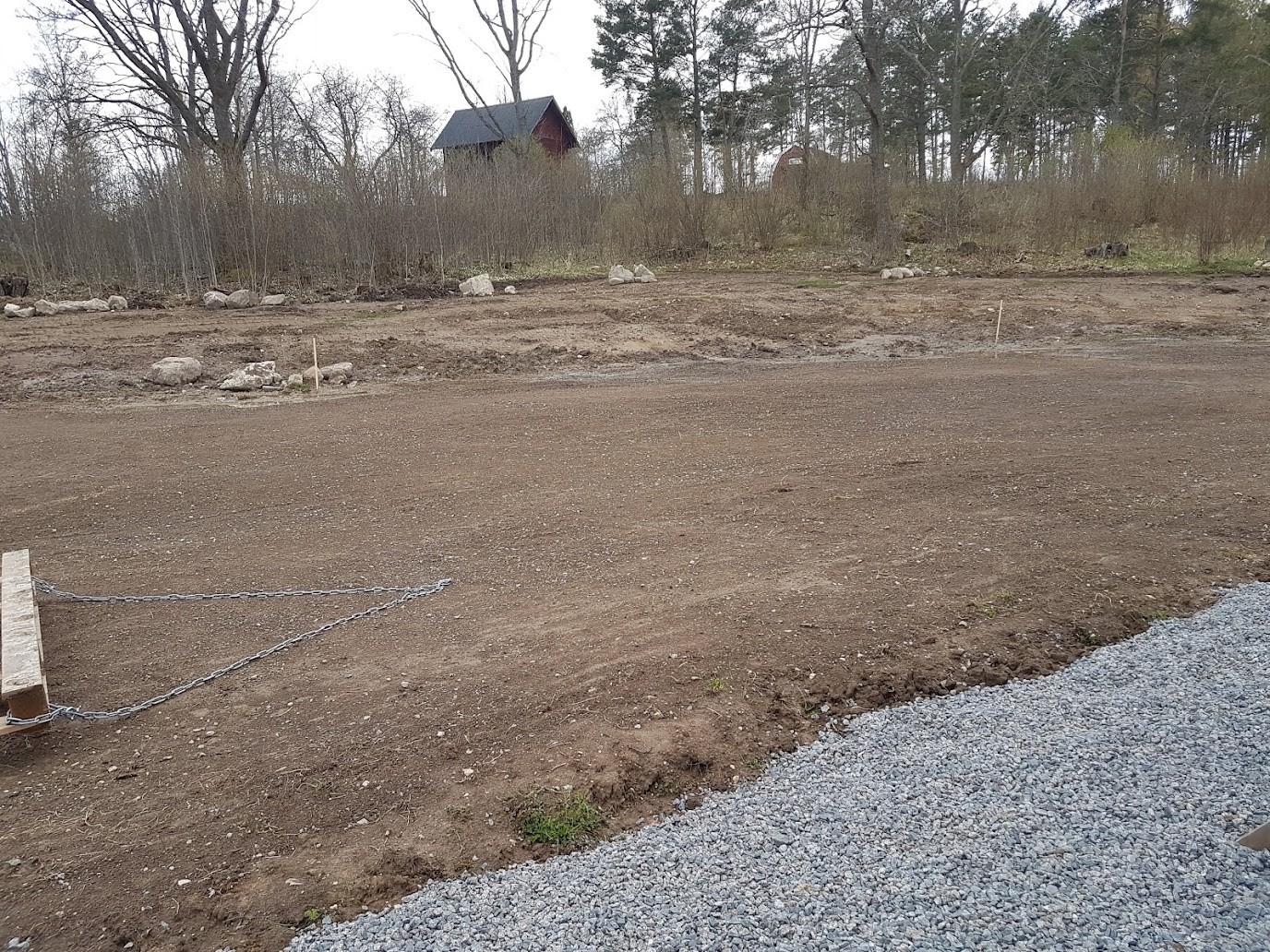 Tomten var tidigare jämt sluttande där höjdskillnaden mellan högsta och lägsta punkten var ca 1,5 m. Nu har vi flyttat runt de befintliga massor så att tomten är mer plan. I bakkant på tomten så har vi en slutning.