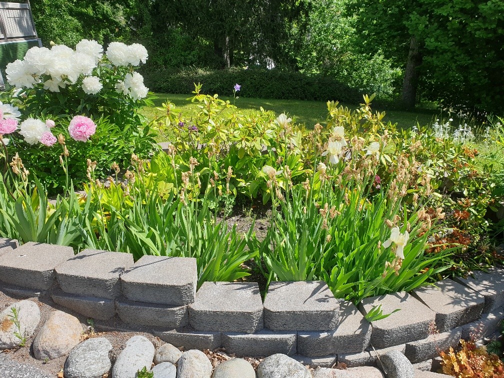 Detta är rabatten med drygt femtio överblommade irisar (samt några galet vackra pioner till vänster)