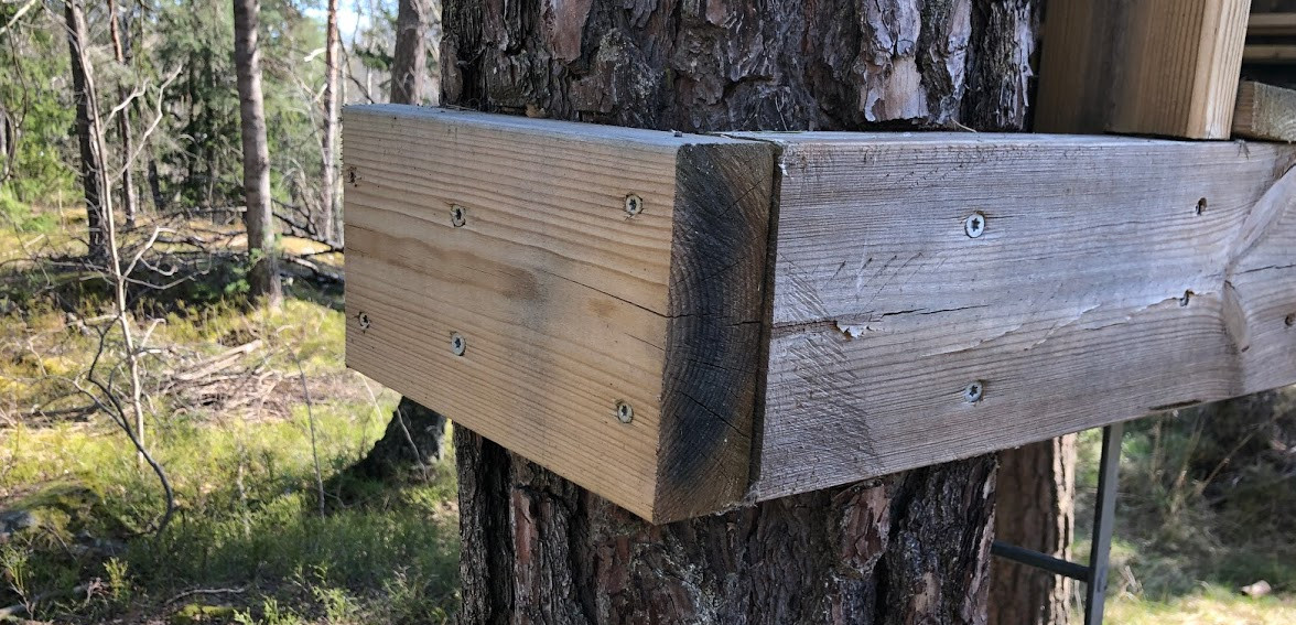 I mitt fall sitter kojan mellan 3 tallar, material i ramverk 45x145 som fästs med gissningsvis 6x140 eller liknande i tallarna (som verkar må bra). Min största farhåga var i princip att trädens naturliga rörelse skulle slita isär ramen men de enda sprickorna jag ser är de som är orsakade av virkets normala rörelse/torkning