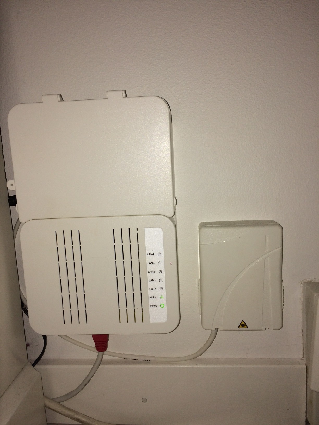 För det man fick när de installerades var tråden genom husväggen som går in i en liten burk, sen ett modem, från modemet går en kabel till routern och sen en kabel från routern till tv sändaren. Inget annat sitter i routern då datorer går trådlöst.