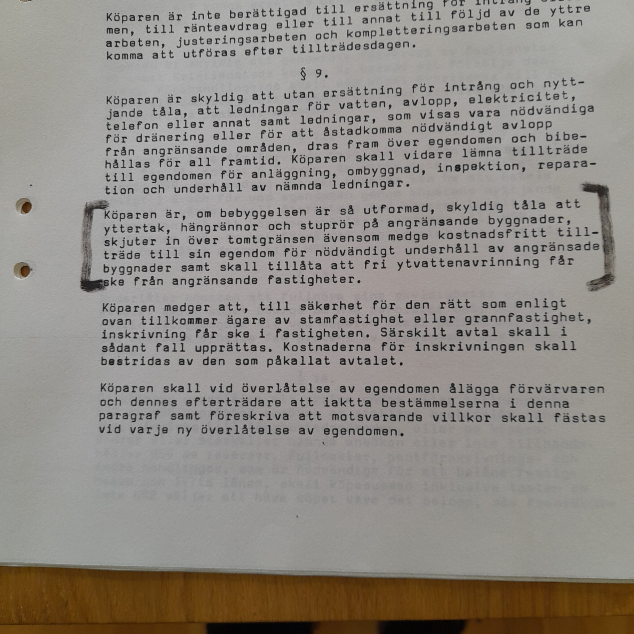 Man kan diskutera hur korrekt detta avtal är om det är inskrivet i ett köpekontrakt och inte som servitut. Samtidigt är det troligt att det är ett område med typ kedjehus av samma typ. I det fall som här diskuteras är det fristående hus av olika typ. I ett sådant område krävs det avtal eller servitut för att kunna utföra underhåll.