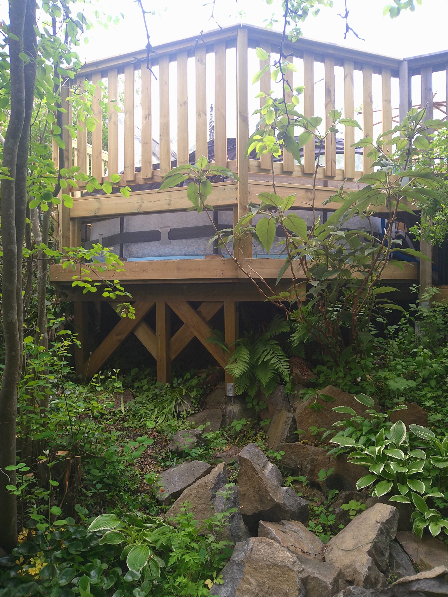 Däcket kommer placeras på berg med stolpskor och får måtten ca 4x4 m.