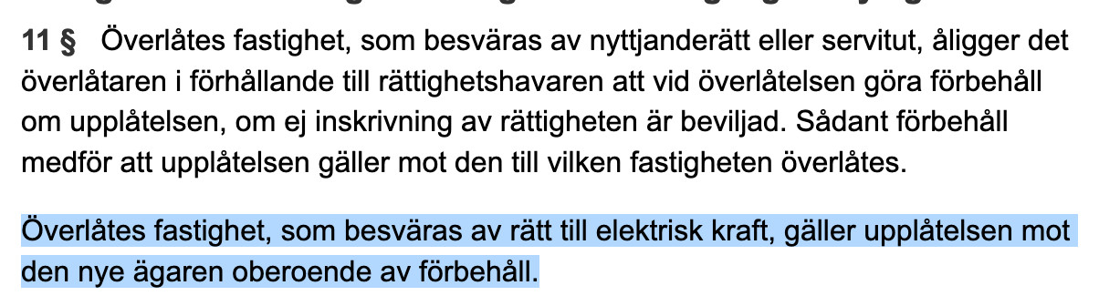 OK, så då gäller ett upplåtelseavtal för ledning med transformator under reglerna för "annan nyttjanderätt" enligt jordabalken? D v s att TS inte känner till någon sådan betyder att den inte kan gälla?R Räknenisse skrev: