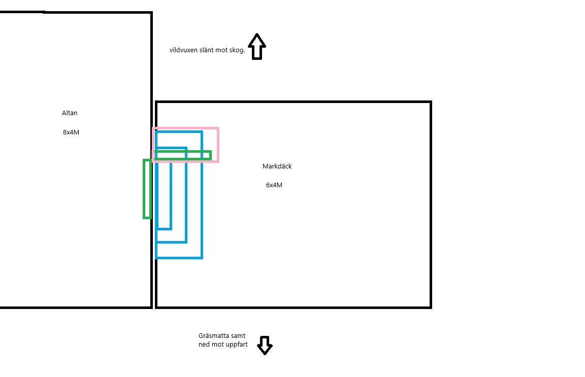 Grinden från altanen markerad med grönt, öppnar max 90° utåt i dagsläget, spärren går givetvis att flytta, då det ovanför bara finns en vildvuxen skogsslänt och ingen väg runt huset där klurar jag på att det är onödigt med trappdel däråt rent praktiskt. I det hörnet på markdäcket står även poolpump och filter.