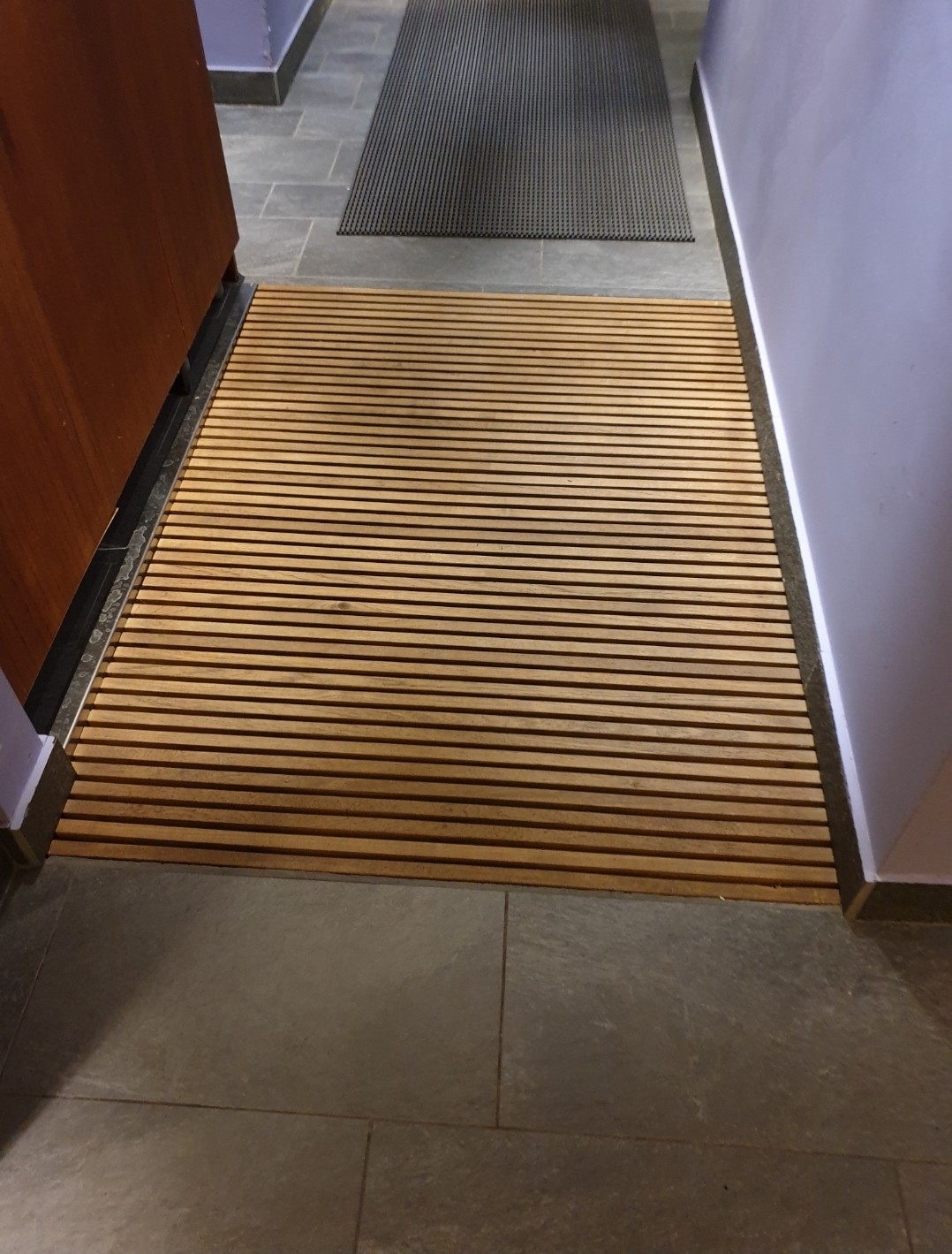 Helst skulle jag ha en lite sträcka på 2x0.8 m typ med träribbor i samma liv som kaklet. Tanken var då att planera detta under flytningen och ha en golvbrunn i "hålet" där ribborna sedan läggs ner. Tyvärr verkar jag ha svårt sätta golvbrunnar vart jag vill pga Siporexbjälklag man inte kan spåra hur mkt som helst i.