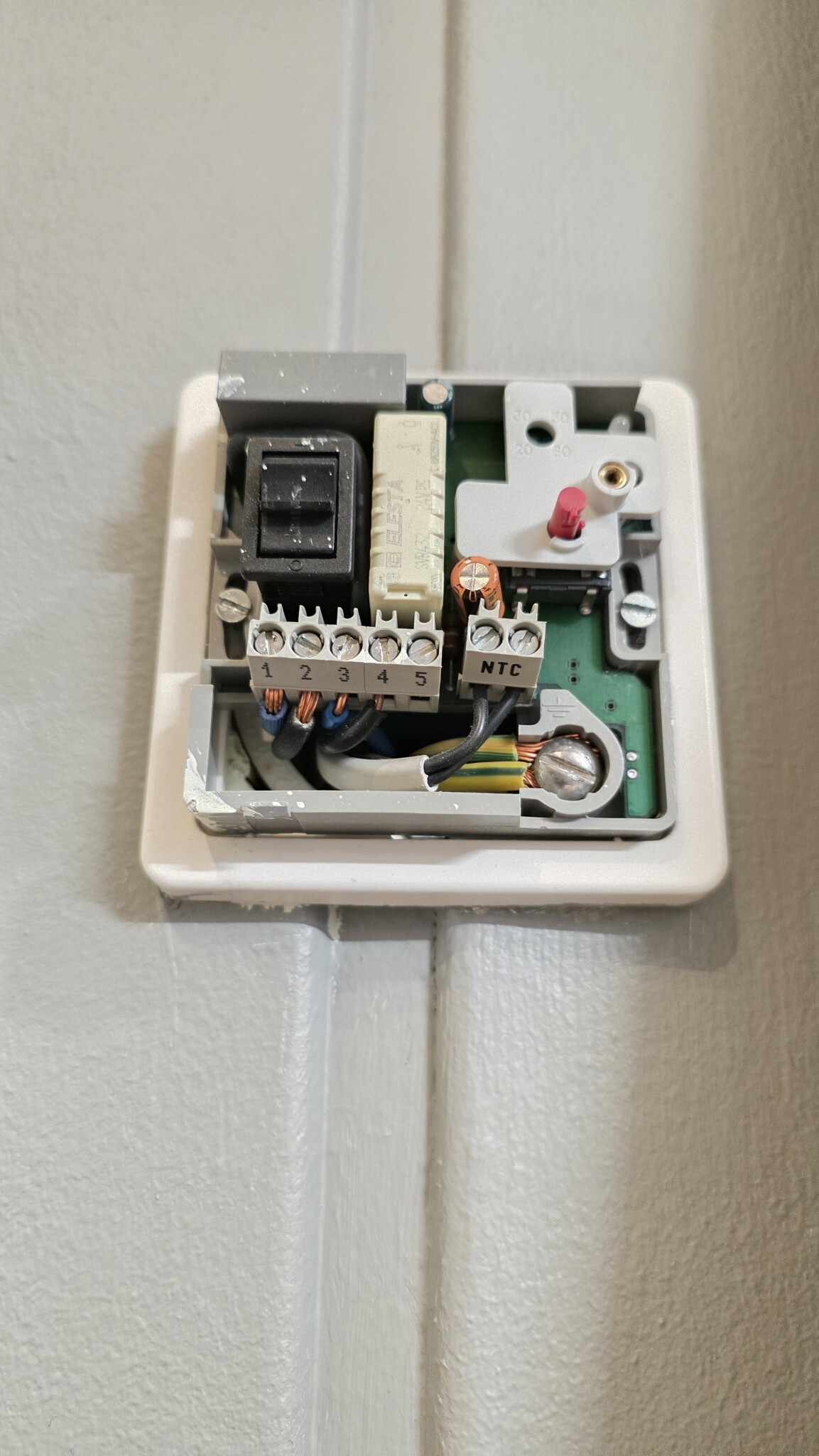 Med byte så är det nog möjligt att behöva byta givaren som är i golvet, går det att dra ur den. Det är den kabeln som är kopplas på plint NTC. Om inte så blir det en termostat som kan känna lufttempen i stället för golvet. I bland så så fuskar plattis/elis med att givaren går ut i golvet och smetas in i fixen och då sitter den fast. Eller att slang som lagts, inte är tätad i änden. Flytspackel rinner då in i slangen och givaren blir inmurad och tvärstopp för att få ut den.