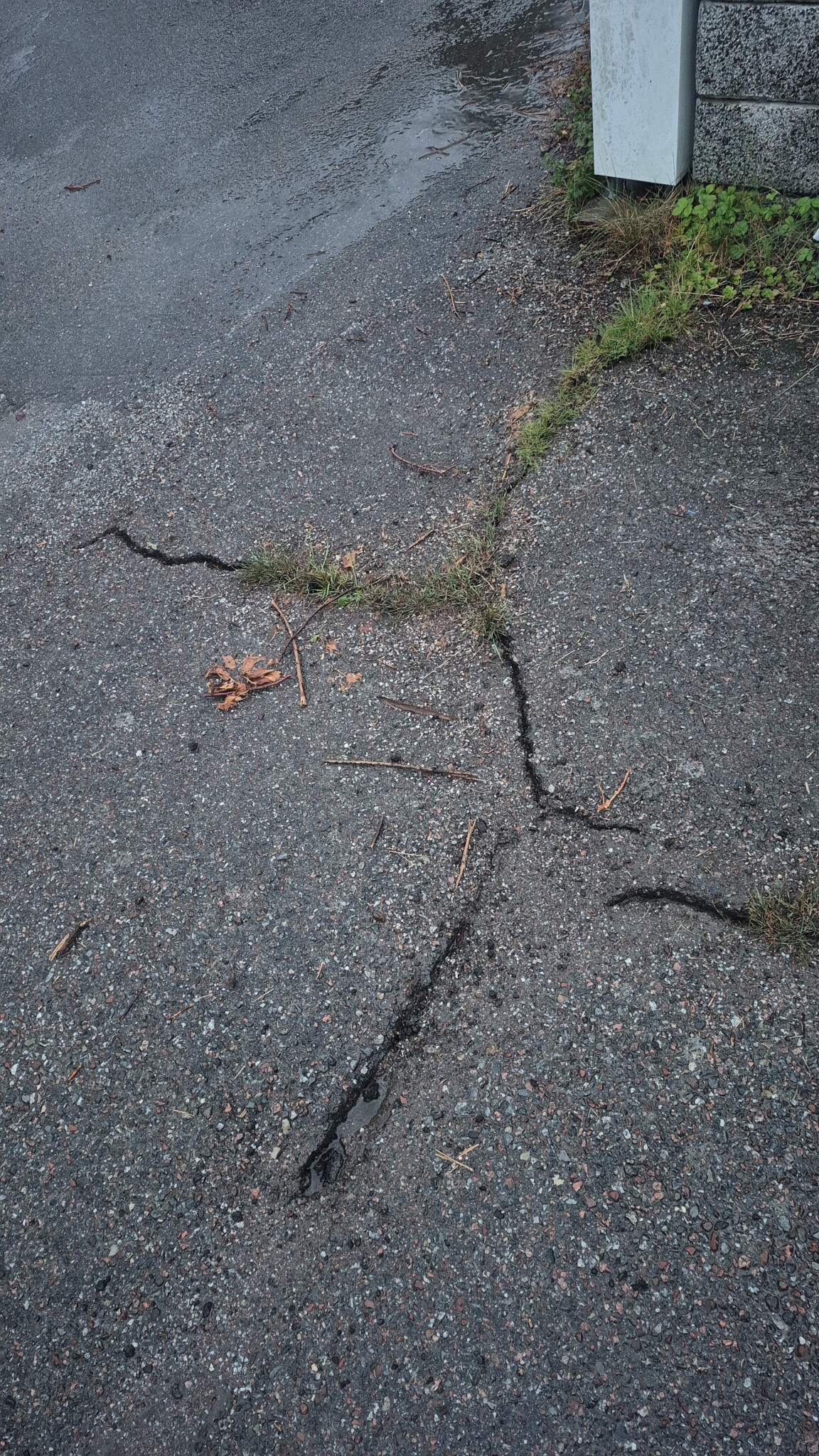 Rensa bort gräset och sopa i så finkornig grus du kan få tag i, slå sen på lite asfaltsklister som du värmt upp eller spätt ut så att det blivit ganska lättflytande.