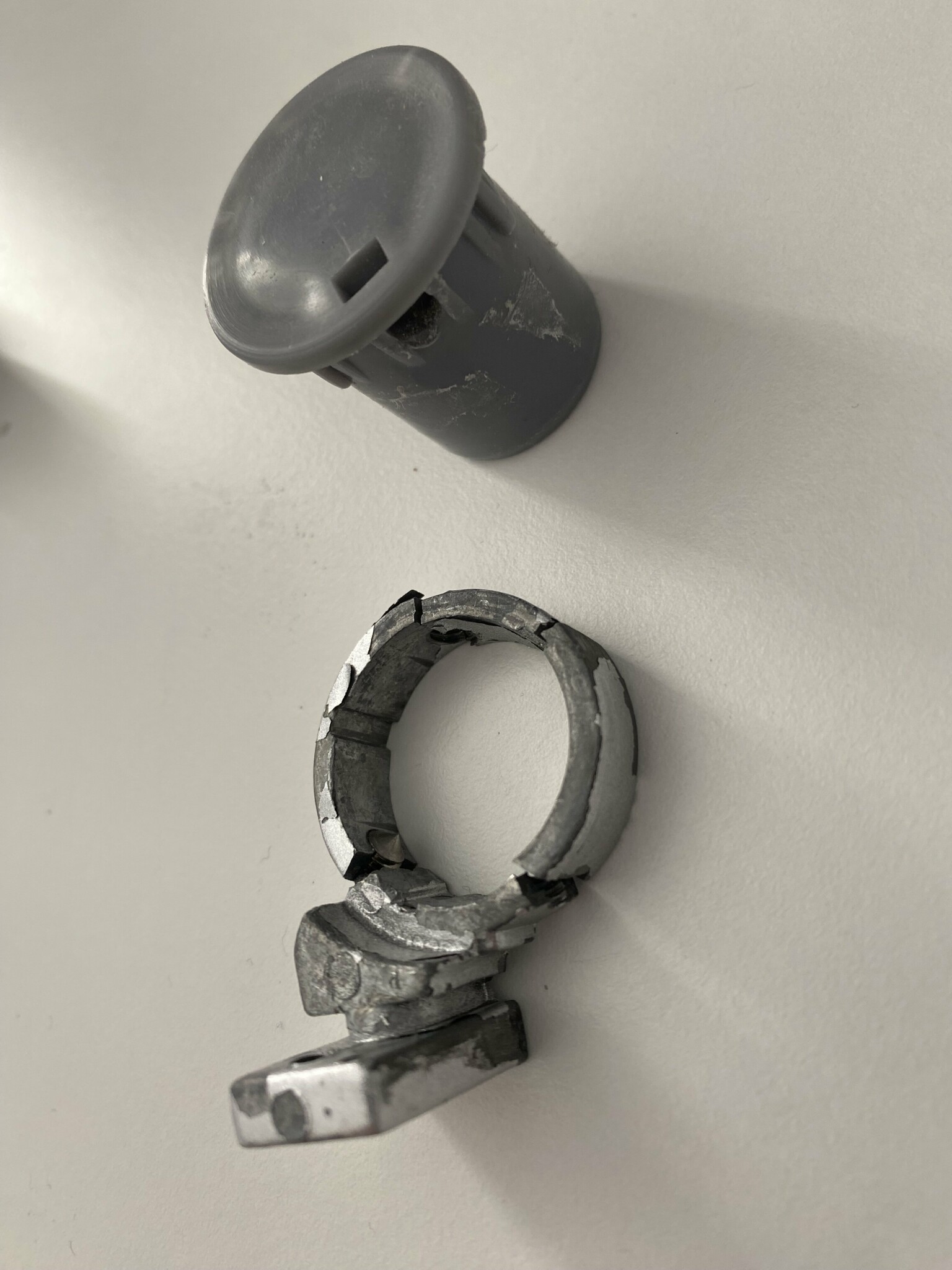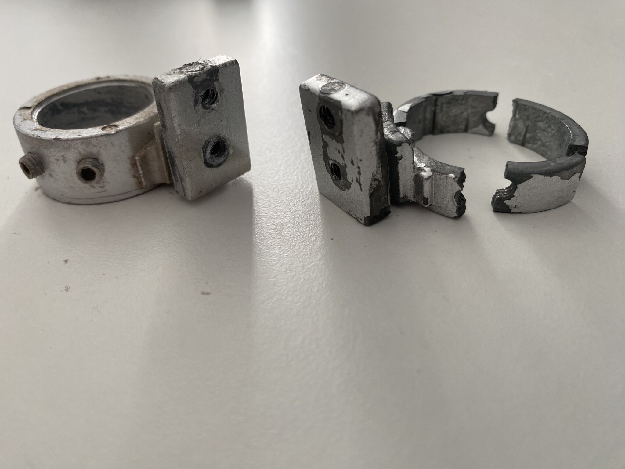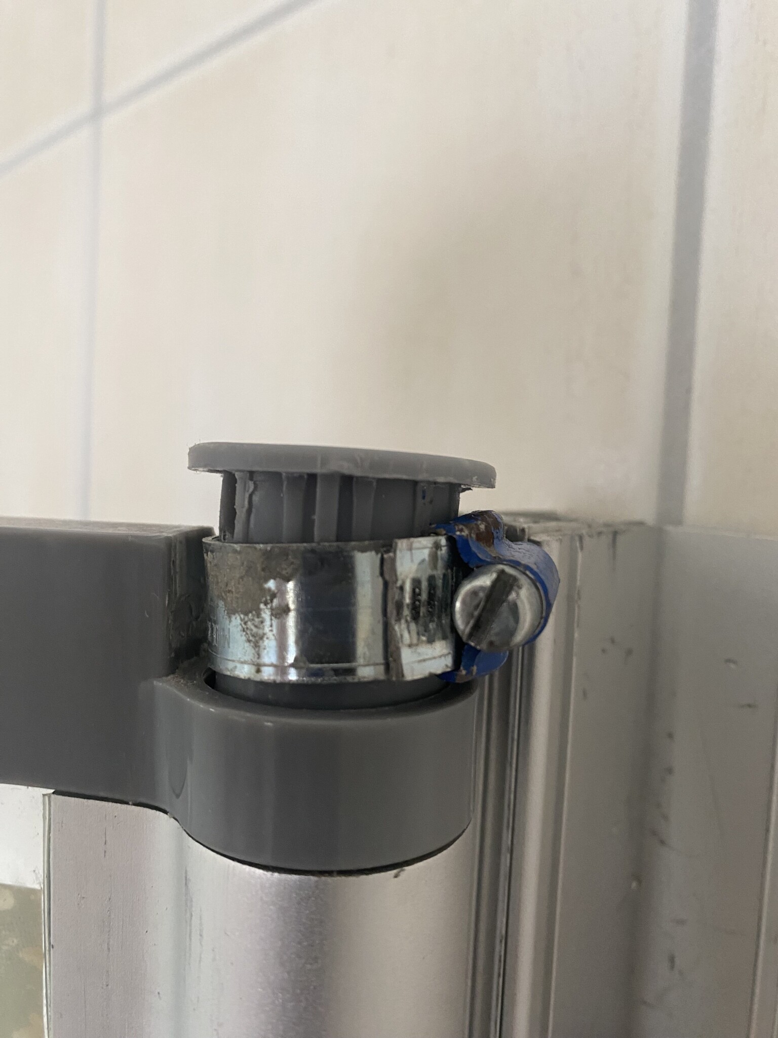 Har någon stött på problem med att gångjärnet till en duschvägg har gått sönder? Se bild på det defekta övre fästet. (Samt det fungerande undre.) Något tips på hur felet kan åtgärdas?