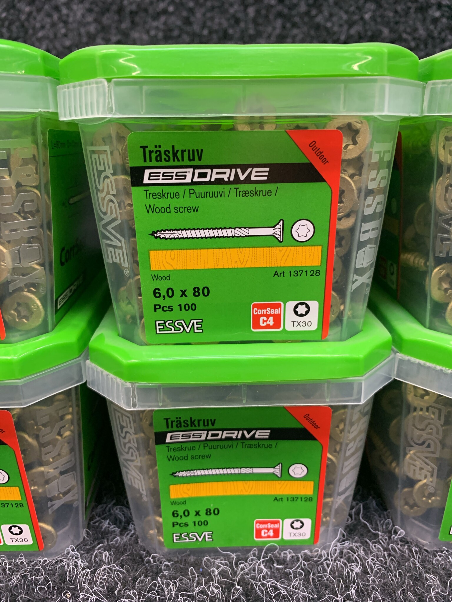 Jag har 24 lådor överbliven skruv, 100 st/låda.Utomhusklassad.