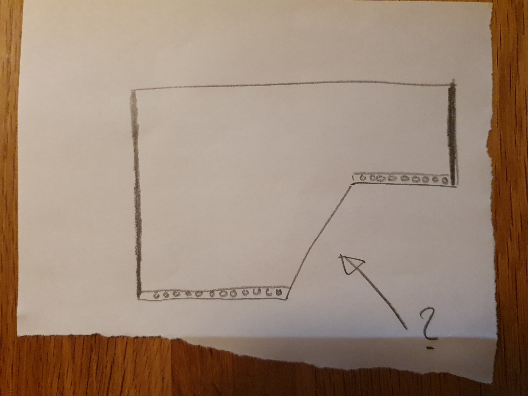 Jag skall ha sedumtak på ett tak som är delvis triangelformat (se skiss). Lutningen är 7.4 grader. På de två raka partierna känns det ganska klockrent att det skall sitta hålplåtar i nederkant. Likaså att man sätter trekantsregel på sidorna (fetmarkerat i skissen). Men hur gör man med den triangelformade delen? Spontant tänker jag att man kanske sätter trekantsregel där också och låter vatten rinna ut genom hålplåten. Eller riskerar det att rinna över trekantsregeln eftersom taket lutar? Och hur gör man med hängrännor? Behövs det eller kan man låta vattnet droppa ner istället? Det kommer iaf bara vara aktuellt med ett stuprör i vänsterkan pga att det är sluttande berg till höger så hängrännorna behöver även förbindas med varandra om det skall vara några öht.