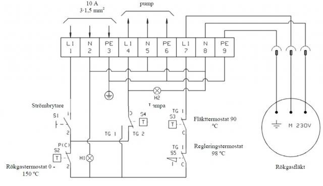Det är egentligen väldigt enkelt men jag rekommenderar inte att någon som inte är kunnig i el att göra detta, eftersom det är mycket viktigt att fläkten verkligen stannar när den måste stanna, dvs om pannan blir för varm. Vi gjorde så att man vänder "upp och ner" på pumptermostaten och kopplar den okopplade delen med en skarv till fläkttermostaten på pannan. Vips, startar laddomatens pump samtidigt med fläkten, men fortsätter gå på pumptermostatens inställda värde. Fläkten fungerar givetvis fortfarande som vanligt.