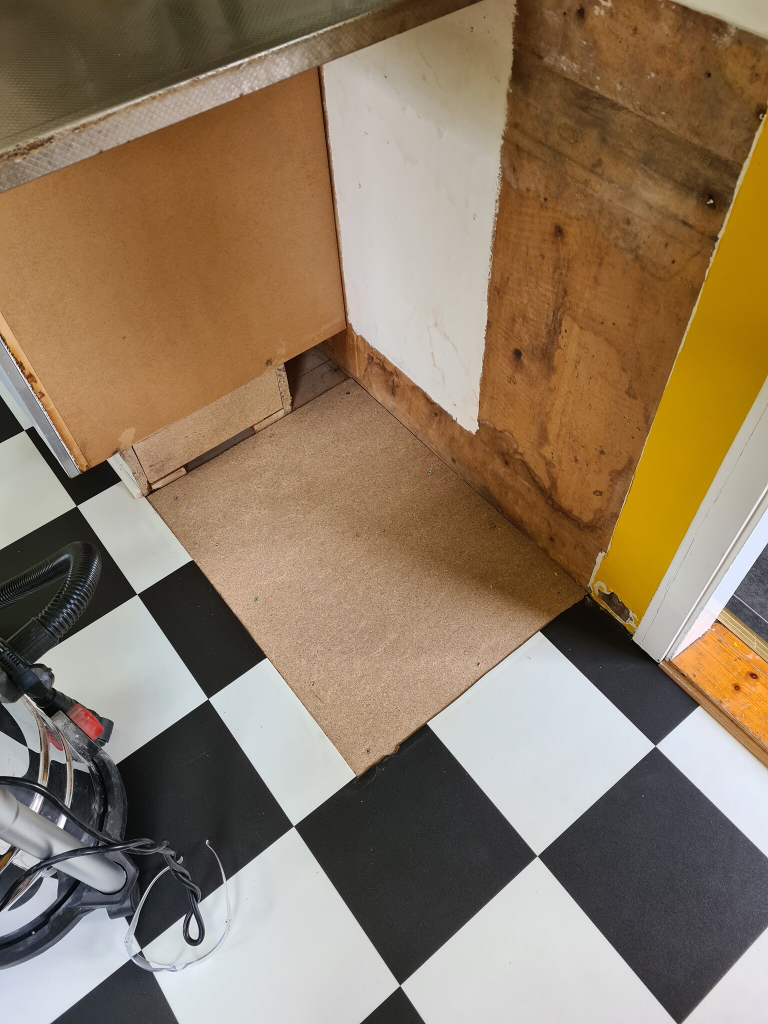 Slet ut två skåp ett 30cm och ett 40cm som ska bytas ut mot ett 20 och en 60 diskmaskin. Men när jag tog ut skåpen var där tyvärr inget golv under alls mer än undergolvet.