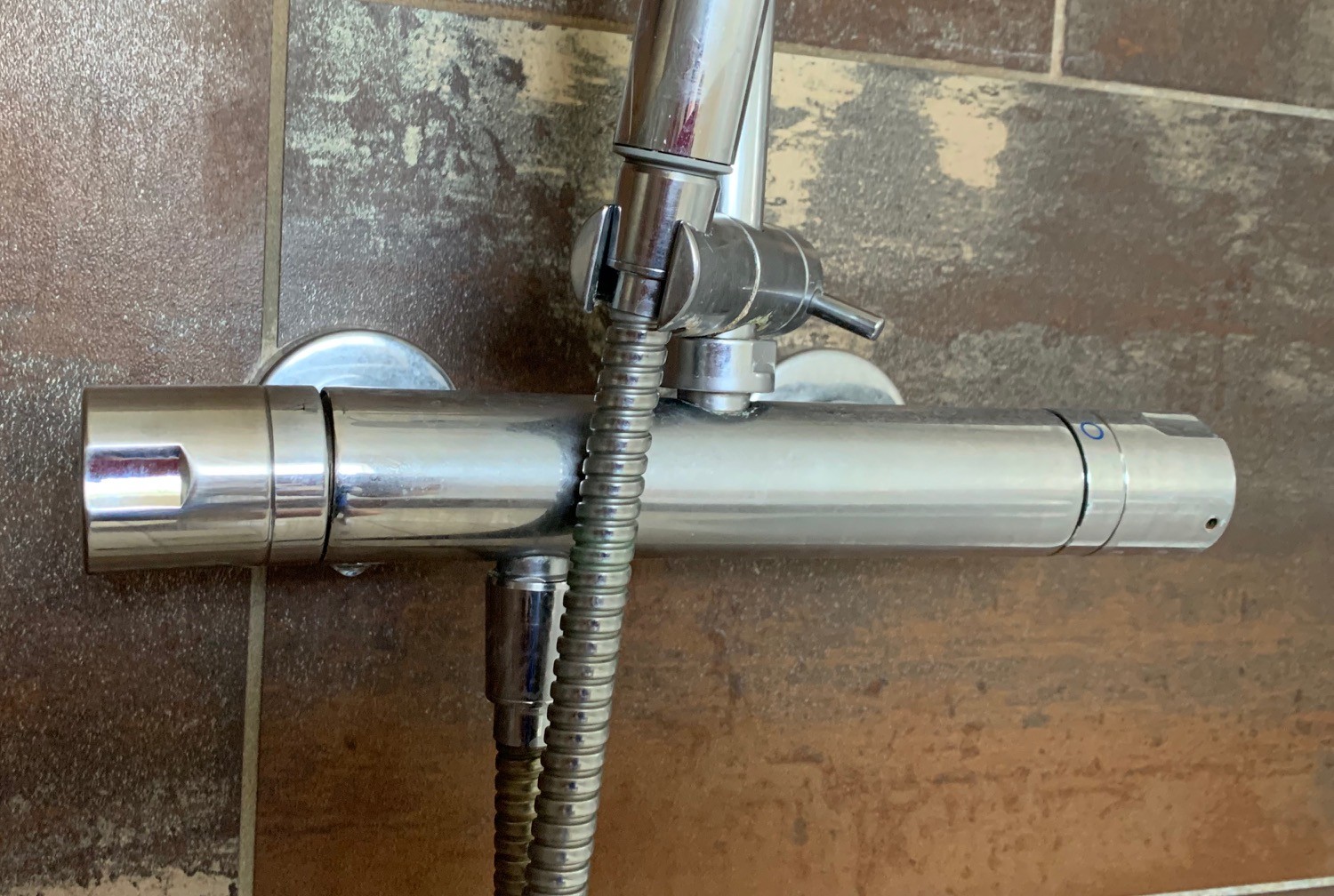 På/av reglaget (vänster sida) på min duschblandare är inte speciellt trög i sig själv, men det saknas något som ger ett bra grepp, och den är därmed omöjlig att reglera/få grepp om man har tvål/schampo på händerna. Ni kan se att det finns en liten nersänkning på reglaget men det räcker inte för att ge grepp.