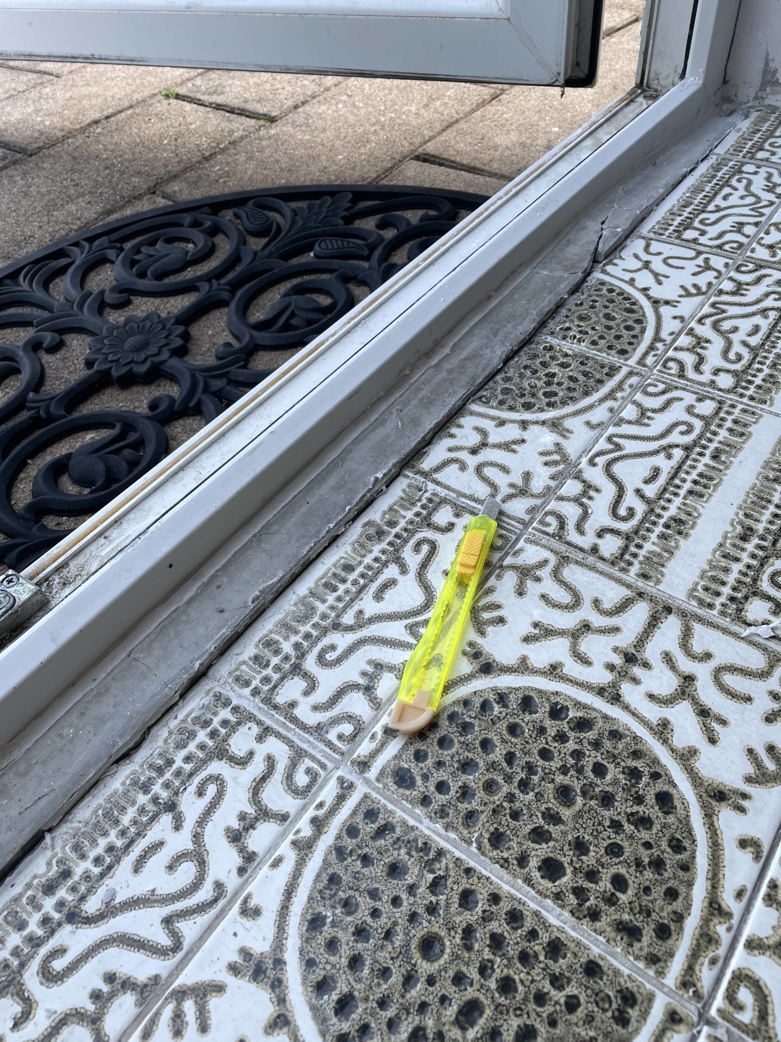 Vårt hus har vid utgången till altanen en plastdörr (dubbeldörr, ca 1300 bred) och golvet i rummet innanför är klinker. Ett gap mellan golv & dörrkarm är ifyllt med ytterst finkornig betong eller liknande. Mellan klinkergolv & betong samt mellan betong & plastkarm någon silikonliknande fog. Problemen: materialen utvidgas olika mkt i värme = fogarna (silikonmaterialet) spricker. Betongen i sig själv spricker också. Jag skulle med handkraft kunna plocka bort det mesta av betongen. Tacksam för tips om hur jag kan åtgärda denna mysko konstruktion. Se bild, brytbladskniven får tjäna som cirka-referens för mått.