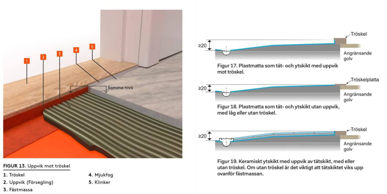 Beträffande det som nämns om gästtoalett så är det sanning med modifikation för där finns krav men inte på några 20mm utan på att tätskiktet vid "tröskel" ska vikas upp minst till plattans ovankant.