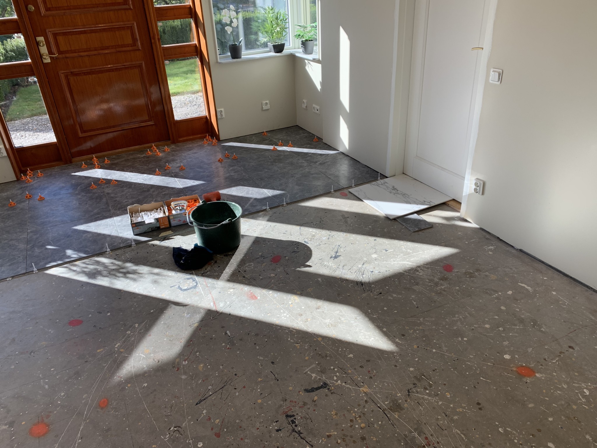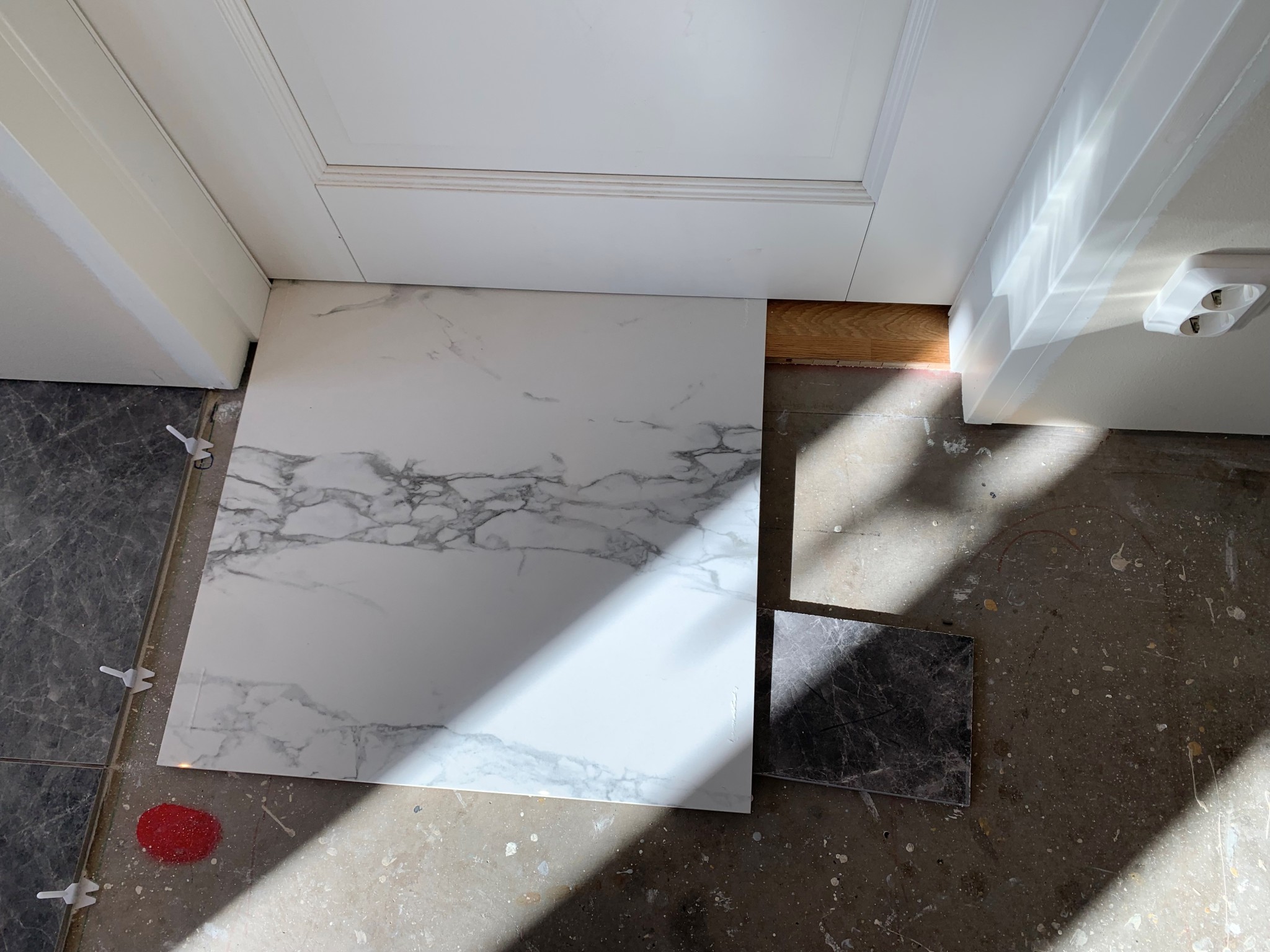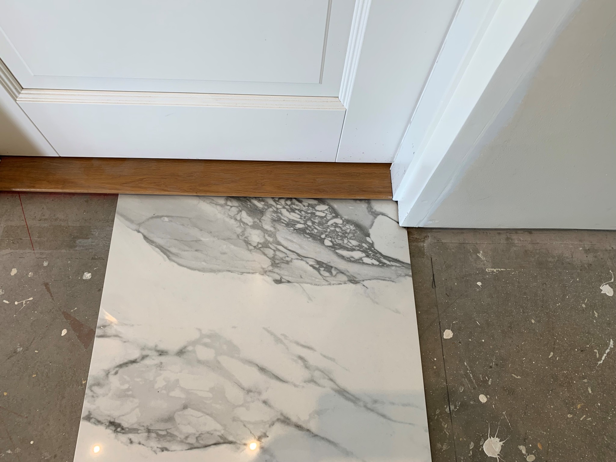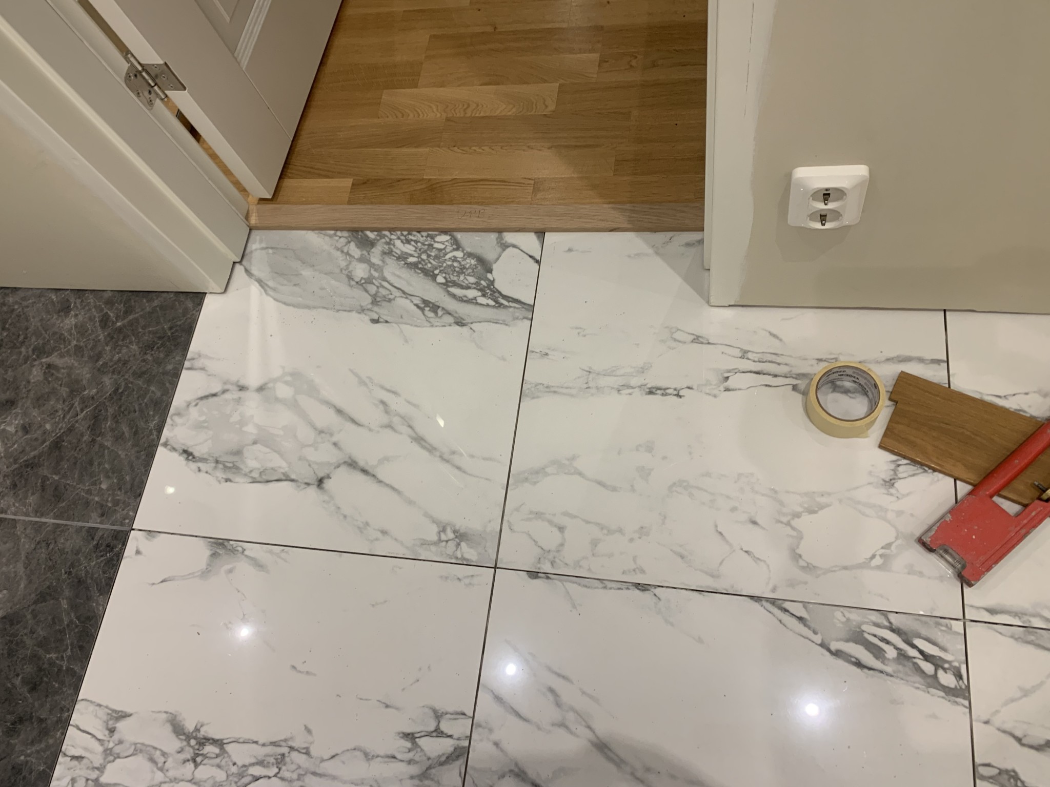 Medföljande tröskelplatta i ek monteras, dock kanske tröskelplattan skall vara lika bred som hela smygen(väggens tjocklek). Intrycket när dörren är stängd blir här att tröskelplattan av ek inte riktigt passar in i rummet i övrigt eftersom det finns inget annat material av trä eller ek där. Dock ser det ju ut som att ett trägolv finns på andra sidan dörren och det stämmer ju.