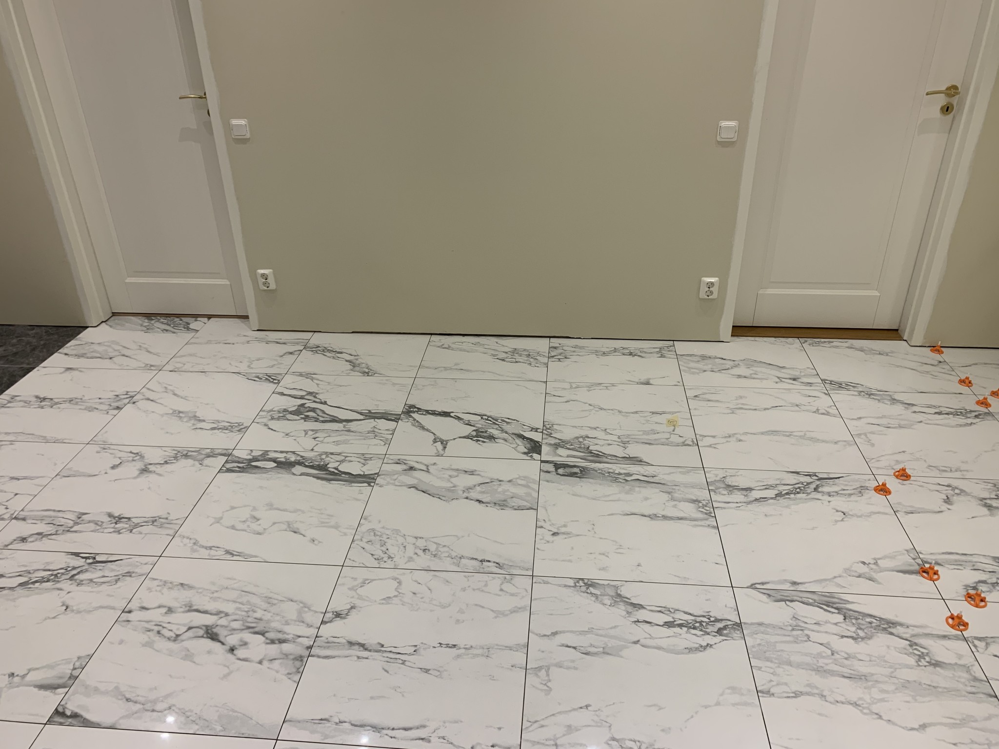 Översikt över rummet där det finns en entré med gråa plattor och övriga skall ha vita (marmorerade), samt flera dörrar in till respektive rum som har träparkett: