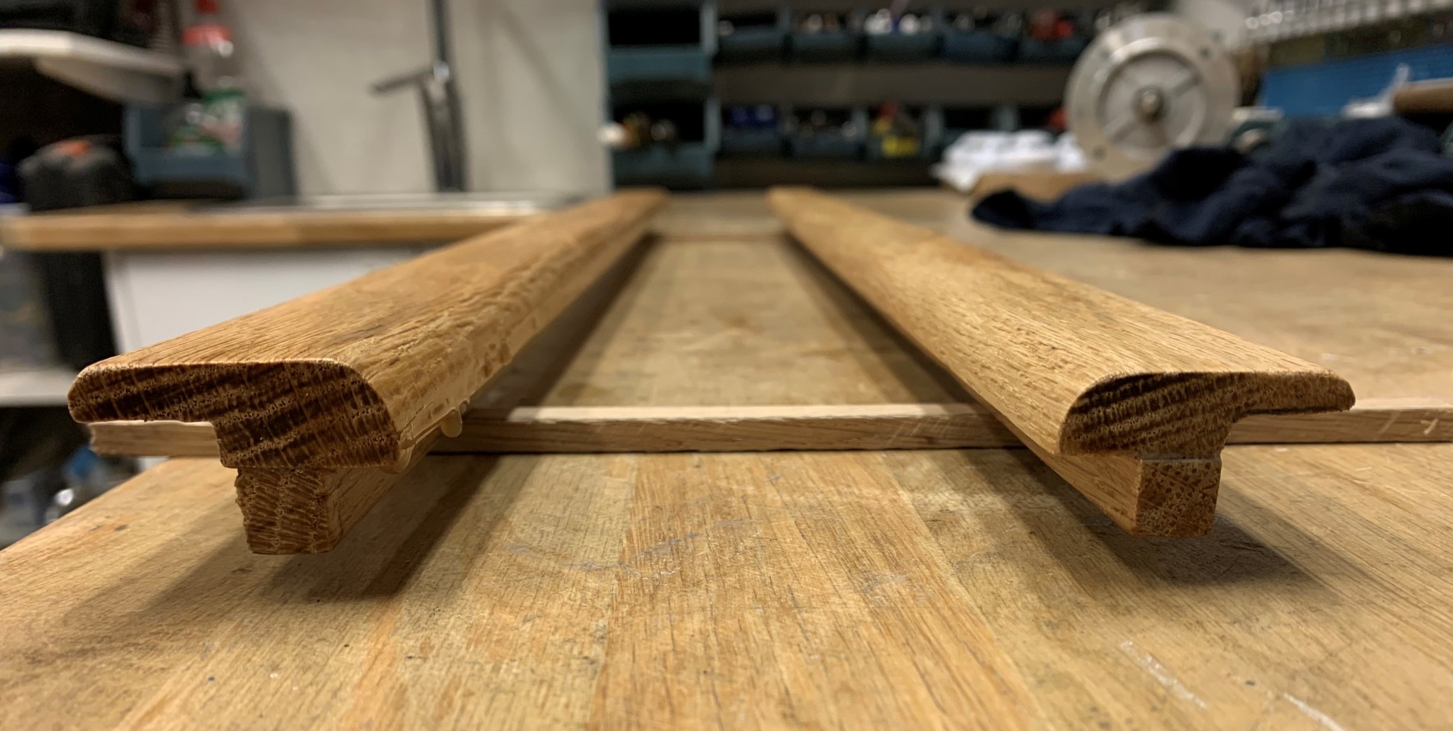 Höjdskillnaden blir 5mm på färdigt golv och jag klinkade som alternativ 1 ovan. Däremot har jag fortfarande valmöjlighet att fräsa till en egen smalare eklist i T-profil eller att ha en bred färdig tröskelplatta i ek.