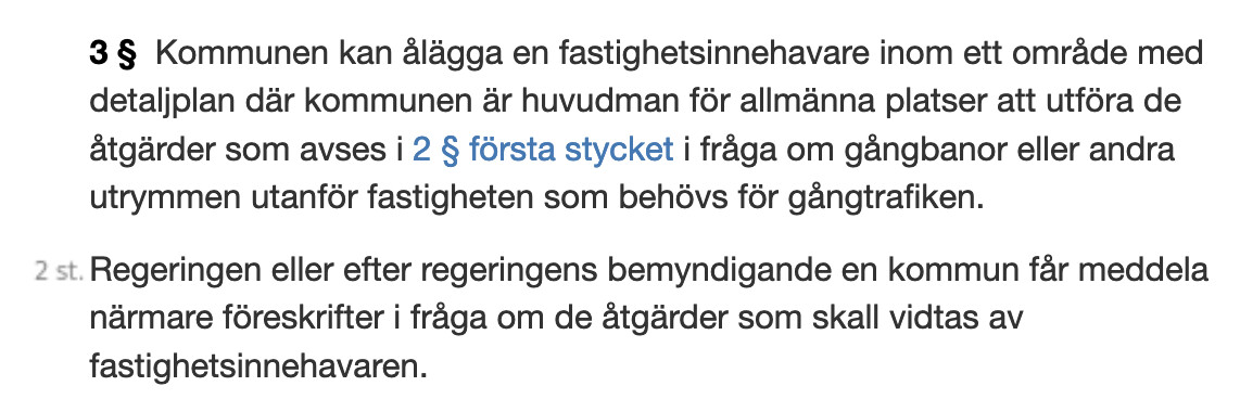 Precis! I min kommun ansvarar jag för den breda, långa asfalterade (ursprungligen gjord av kommunen) trottoiren gränsande till min fastighet. Det gäller både snöröjning och borttag av löv och ask-grenar under vår/höst.Claes Sörmland skrev: