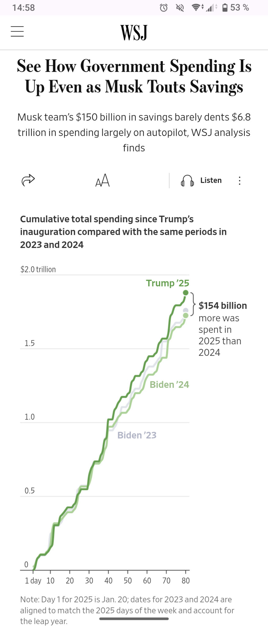 Jo, håller med om att många länders byråkrati skulle behöva en rensning. Man bygger bara på hela tiden, som att byråkrati har ett egenvärde som bör eftersträvas. Nej, visst är USAs enorma statsskuld inte sund. Något behöver absolut göras. Tyvärr tror ju inte jag att Trump eller Doge är bra på så många sätt alls. Trump passar kanske bra i en TV show, men inte överhuvudtaget den position han innehar. I mitt tycke så kan omöjligt Harris varit sämre på i princip något alls. Trump är i mina ögon inte bra, han ligger en bra bit ner på minus-sidan.