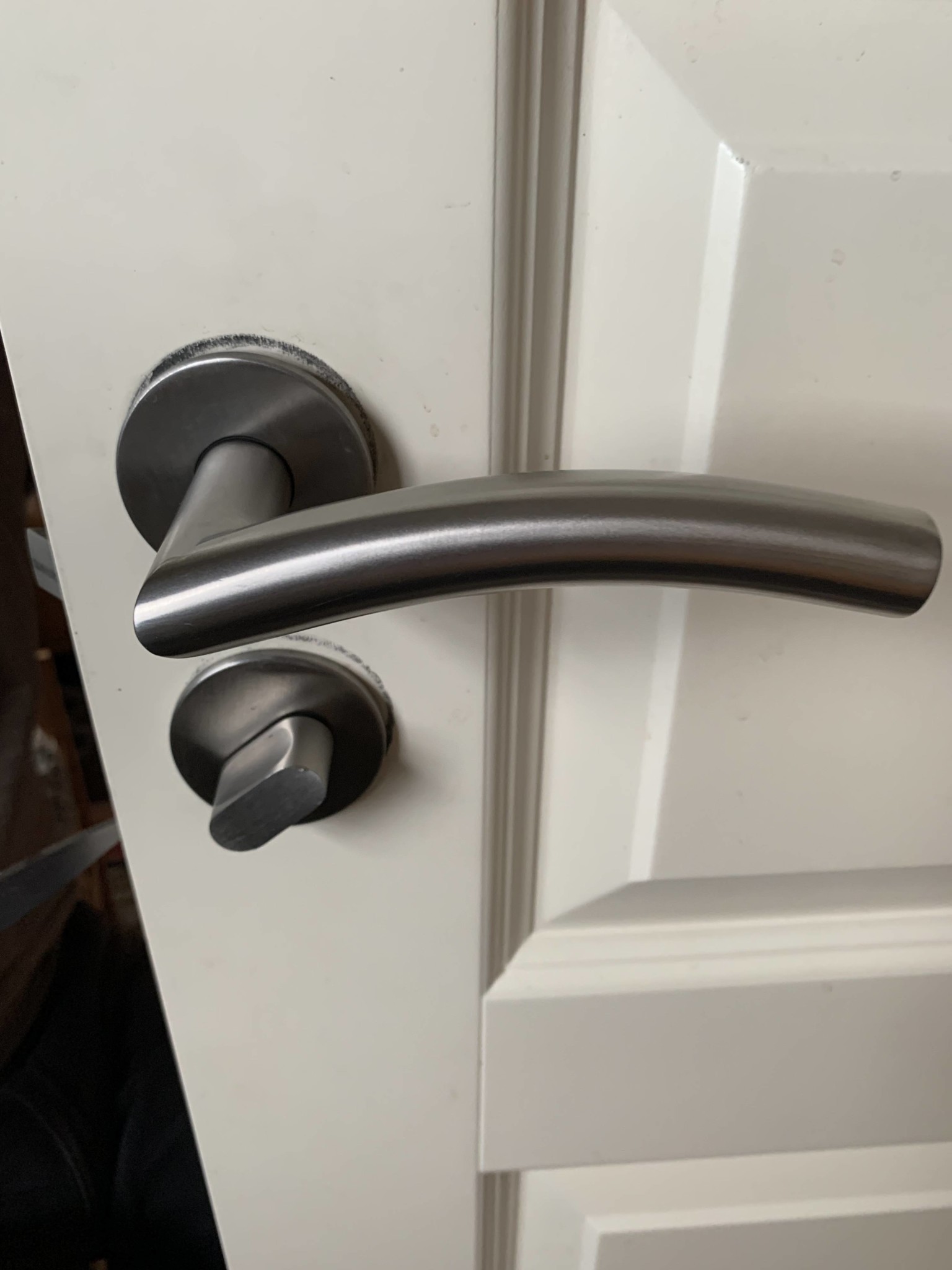 Jo vi skruvade bort dem. Fick inte isär handtaget ändå. Googlade fram att bakom täckbrivjan sitter skruvar som drar ihop hela handtaget. Men täckbrickan satt rejält fast så med lite skydd mot dörren och en skruvmejsel så bände vi loss den. Nu är det fixat?