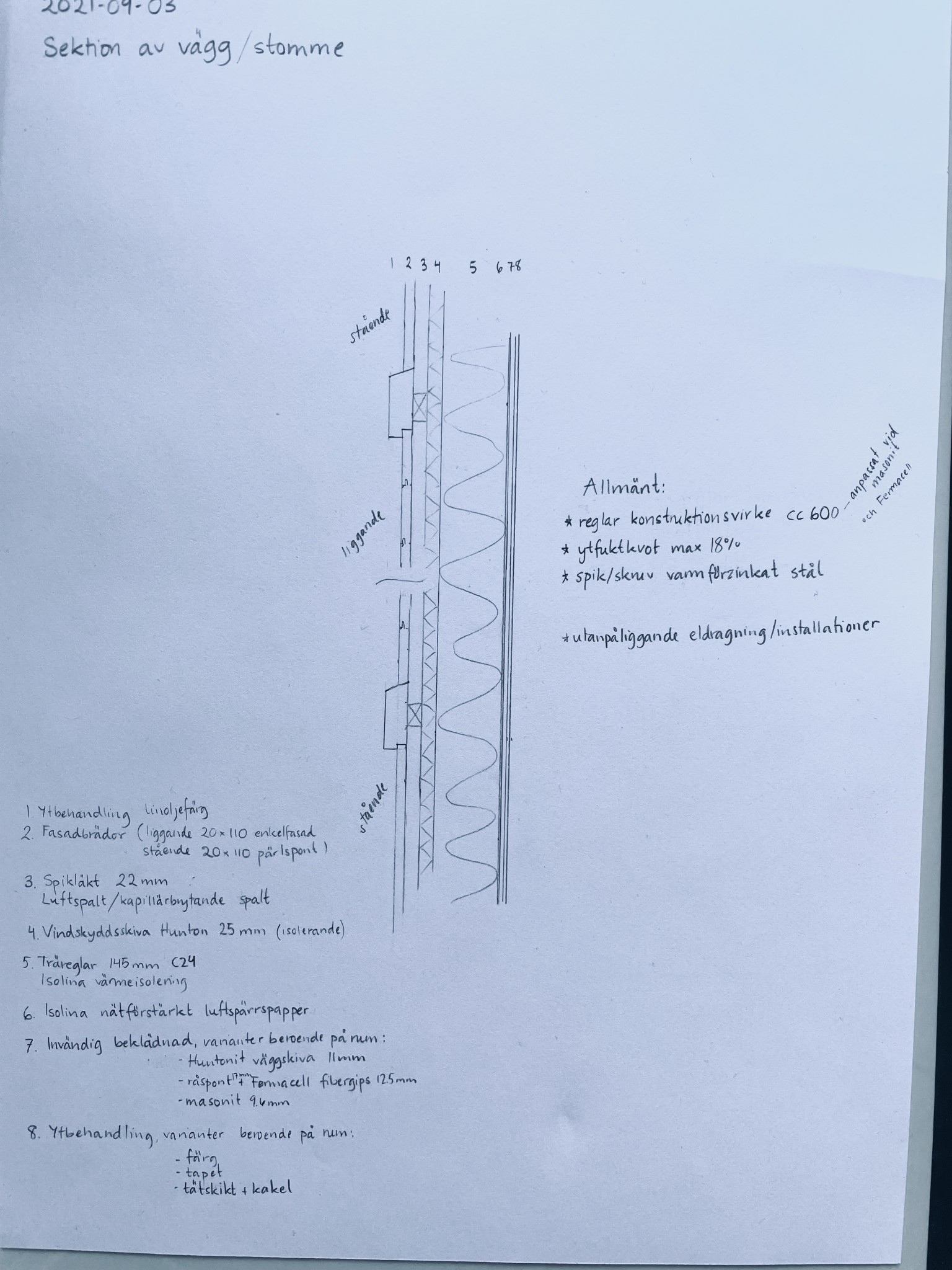 Just nu har vi timrade väggar med fasad direkt på, de är 16 cm (inklusive inre väggbeklädnad) och håller värmen fantastiskt. Våra befintliga väggar skulle ha ett u-värde runt 0.85, och en dålig nutida vägg är 0.2.