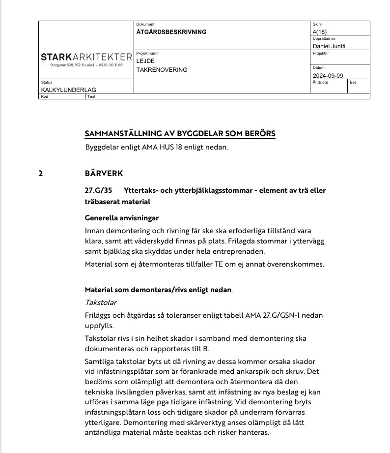 Via våra jurister utfördes en ny besiktning av takkonstruktionen och besiktningsmannen konstaterade snabbt att den aldrig sett så mycket fel gällande montage av takstolar. Samtliga 22 takstolar var monterade fel (Bifogar sammanfattning av besiktningsutlåtandet). Rekommendationen blev att kontakta konstruktör för att lägga upp en plan för åtgärdande.
