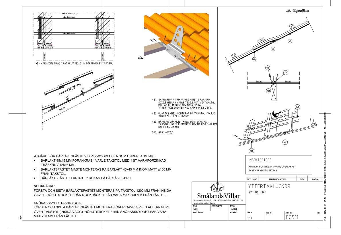 Jag utgick från att smålandsvillan följde bygggnorm/ monteringsanvisningar. De orginalritningar smålandsvillan (Villa Ekjsö) utgått från följer varken AMA-hus eller Benders monteringsanvisningar. Vi har takstolsavstånd på 600mm förutom i trappen där det är 1200mm. Det är ok att använda bärläkt 45x45 när takstolsavståndet är på mellan 600-800mm enligt AMA-Hus och Benders. Smålandsvillan har utgått från detta men "glömt" detaljen att det är trapp upp och där växer avståndet mellan takstolarna till 1200mm. Alltså är det 45x70mm som gäller över hela taket för att garantier ska gälla. Man har även tagit med en bild från monteringsanvisningen från Benders i ritningen. Den visar att snöraskyddet ska monteras i bärläkt 45x70mm. Är för övrigt helt omöjligt att montera snöraskyddet korrekt i enbart 45x45 och inte okej enligt Benders.