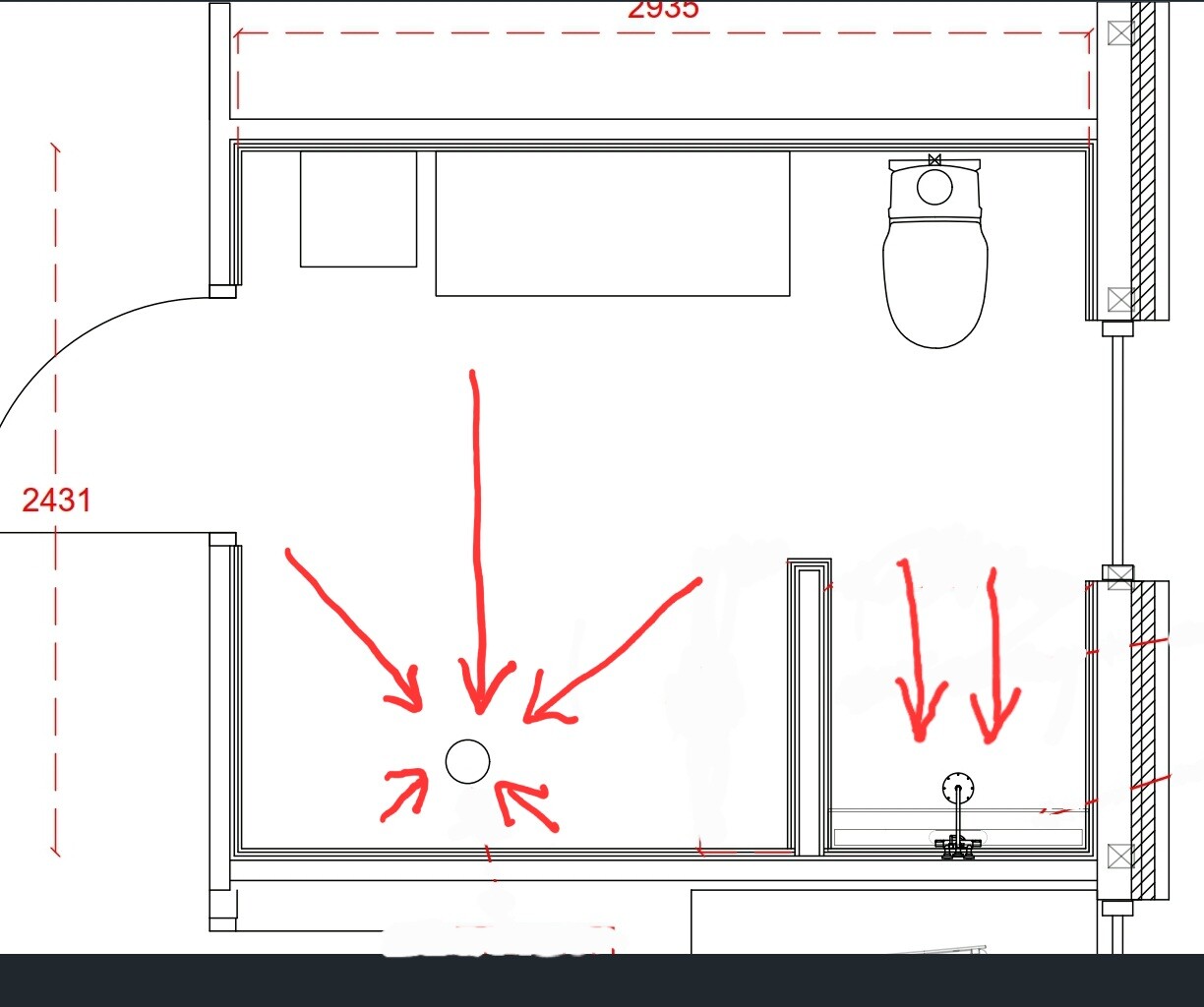 Det är ju kort avstånd från den till tröskeln så det blir rätt brant att få till 2 cm på det korta avståndet eller så blir tröskeln onödigt hög. Det finns begränsningar på hur brant fall som får finnas på ytor som man går på (utanför duschen) pga. halkrisken.