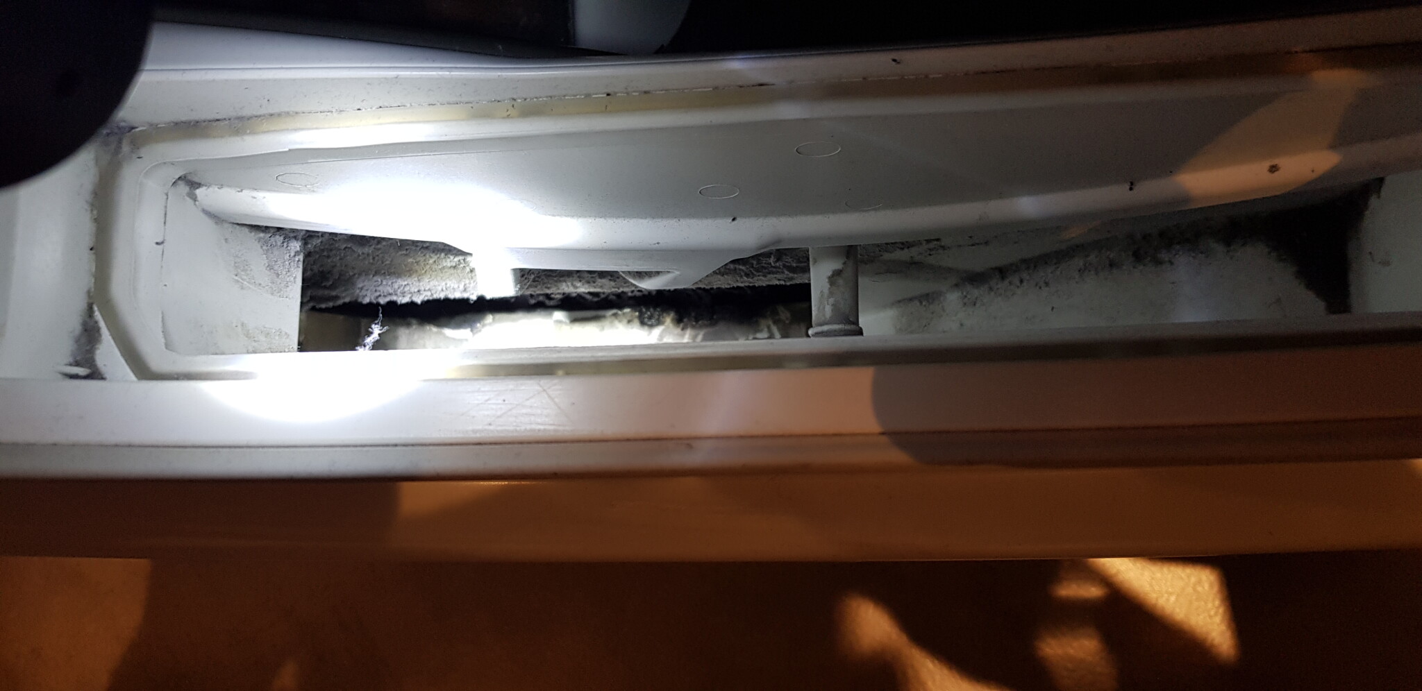 Tittar man ner där är det en del tort ludd som sitter efter kanterna. Brukar försöka dammsuga rent där med dammsugaren när man dammsuger tvättstugan.