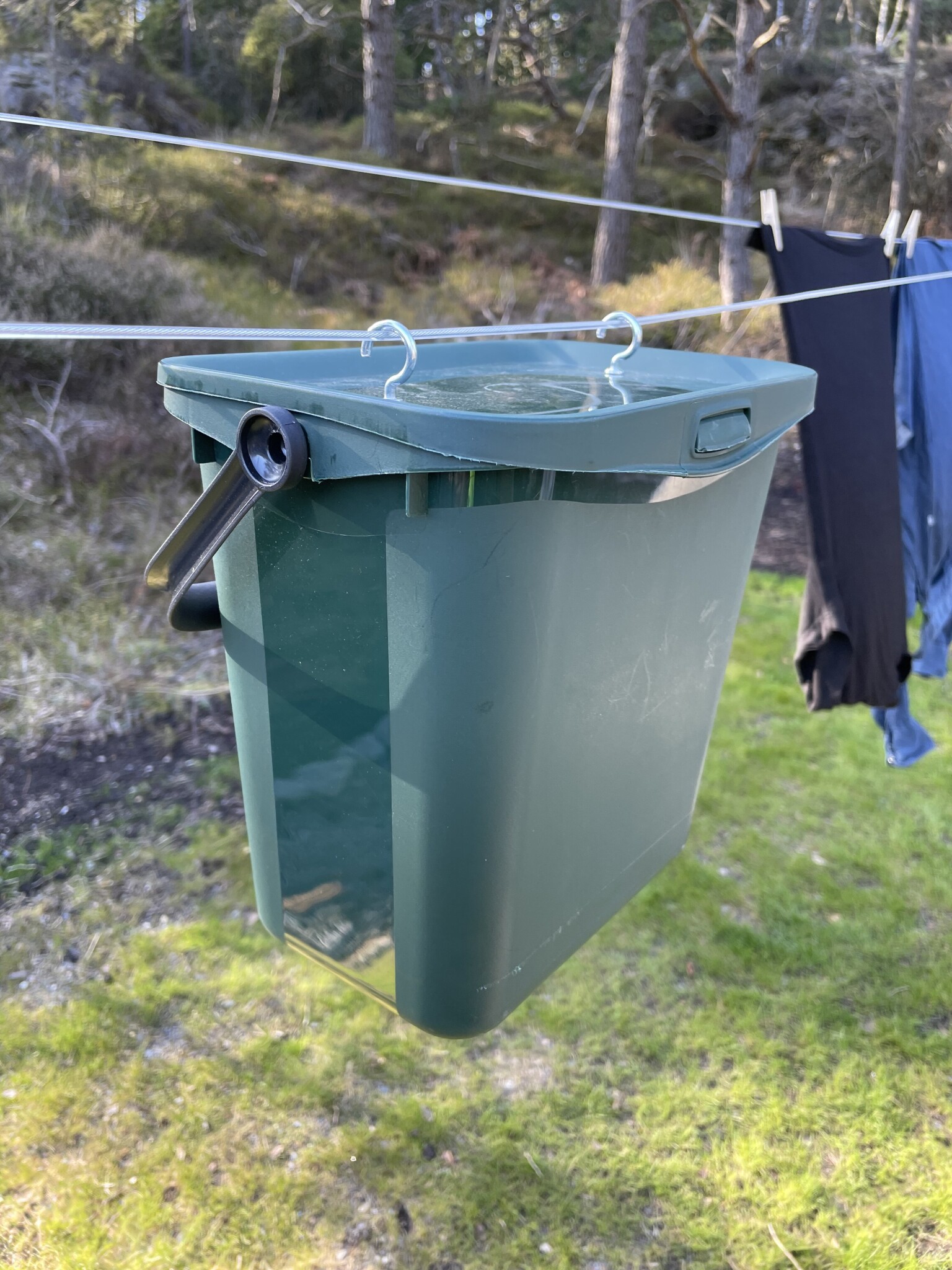 Återvinnings hink från Biltema med lock som låser sig. Satte i 2 krokar o en spillbit med plyfa. Hänger nu på linan, kan glida med utmed linan och lätta att plocka/lägga i nyporna. Ska bara borra några hål under och precis under kanten på locket så att den ventilerar om nyporna skyller vara blöta.