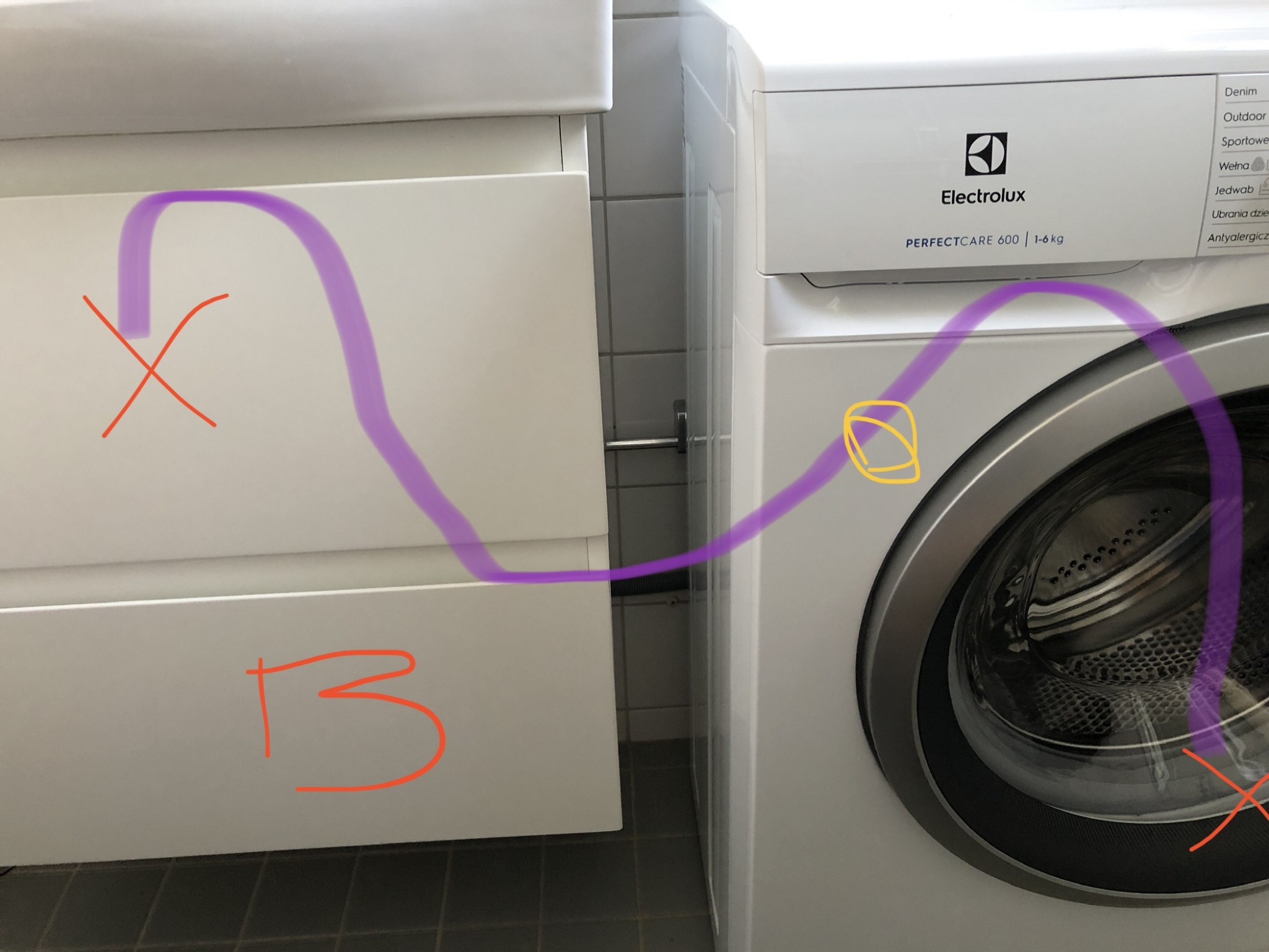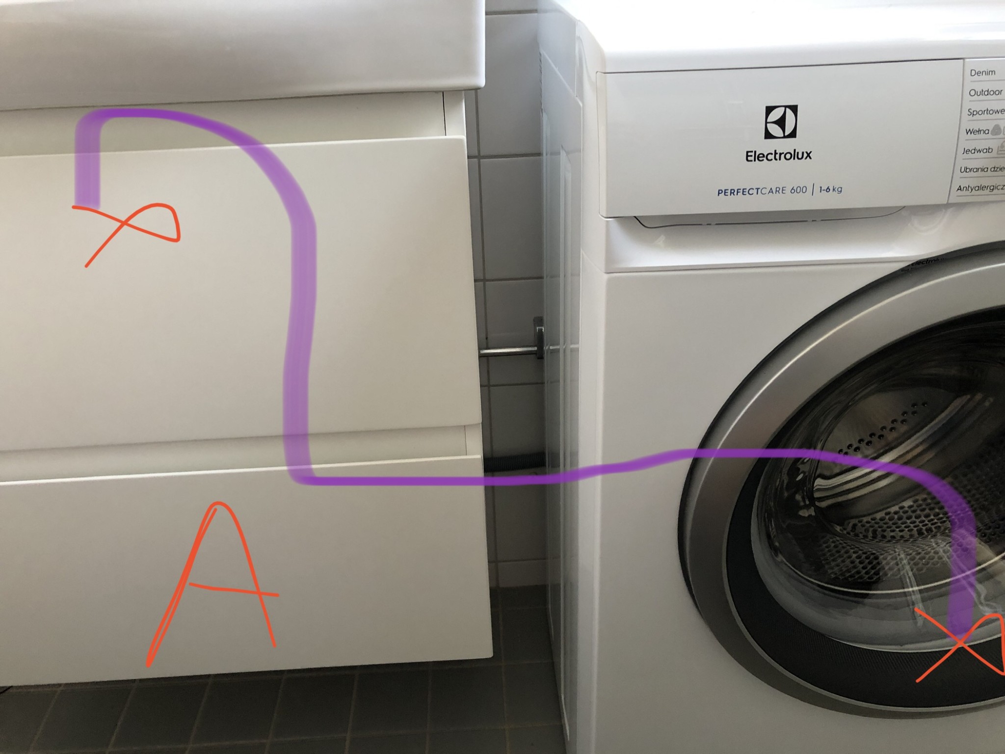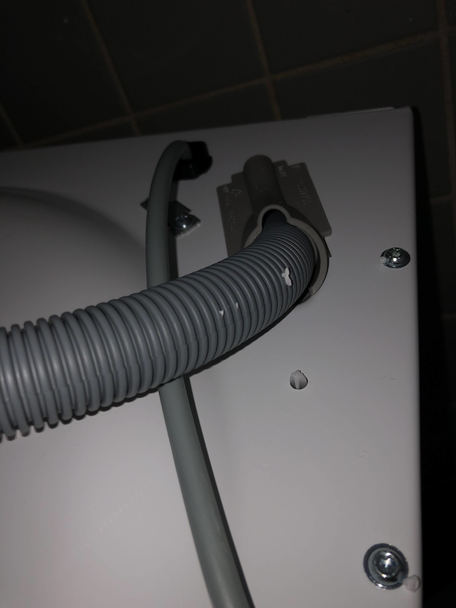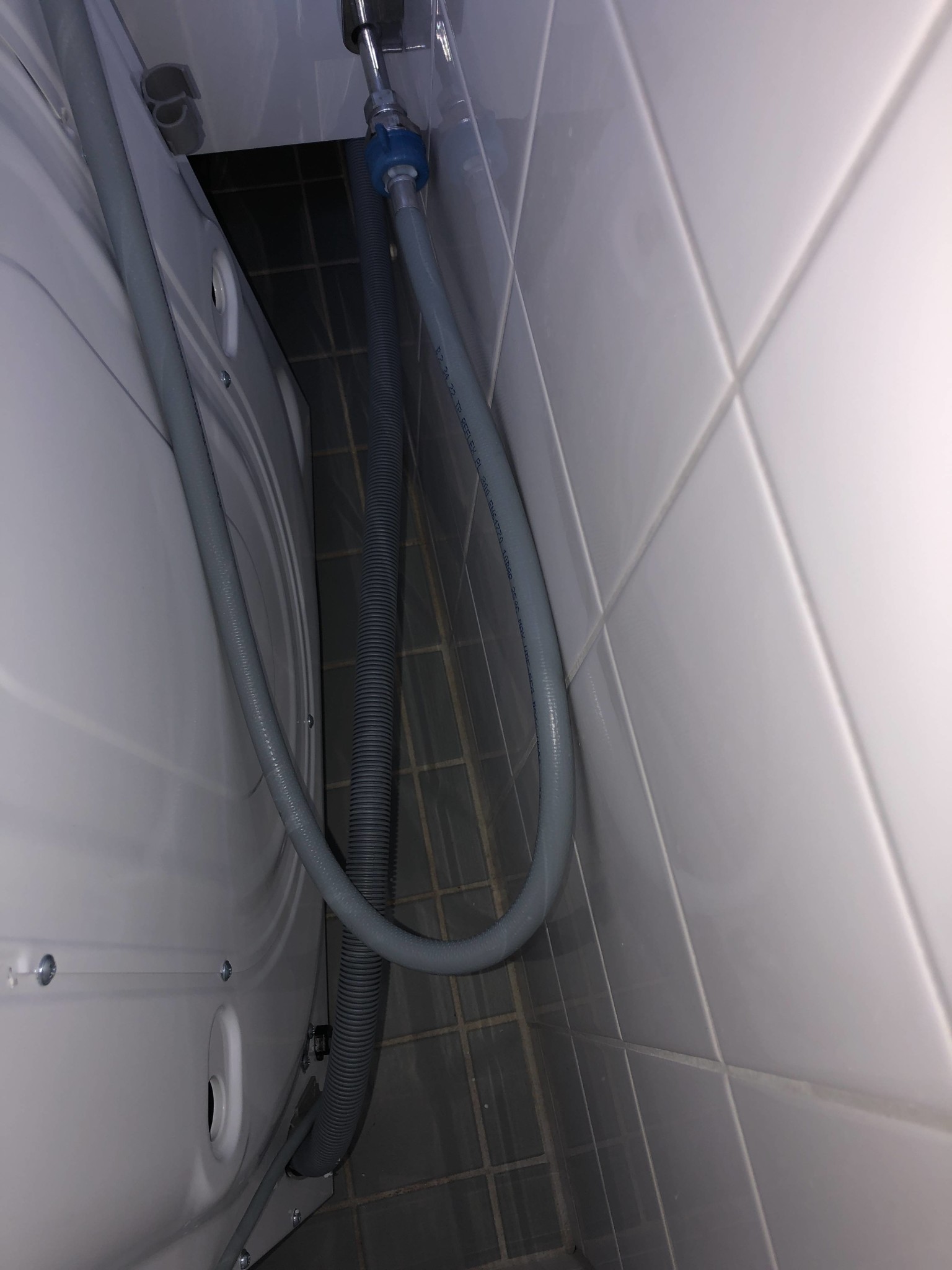 Maskinen står sida vid sida med handfatet och avloppsslangen går underifrån kommoden in i avloppsröret precis under handfatet, fäst med slangklämma i en öppning avsedd för TM. Installatören drog av slangen från det fixerade fästet på baksidan av TM, det som håller första delen av slangen upprätt från golvet, annars skulle den inte nå avloppet. Konsekvensen av detta är att slangen löper längs med golvet från maskinen in under kommoden och därefter ca 50 cm över golvet in i avloppet med en böj på slutet. Är detta en risk och framförallt vad skulle det innebära att lyfta maskinen 25-30 cm från golvytan jämfört med avloppets placering? Lite trist att han inte rekommenderade en ny slang alt förlängning då det verkar vara i enklaste laget. Nu är klämman på baksidan av maskinen borttagen och han verkar ha slängt den efter installationen.