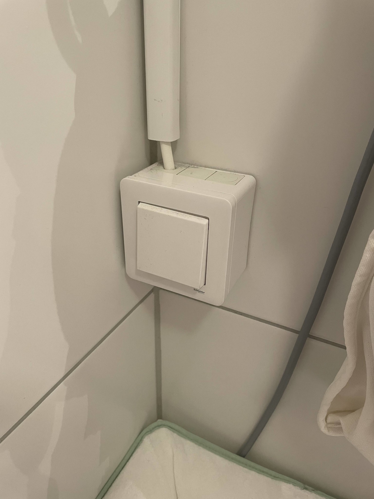 Jag har kommit fram till efter att ha läst på och pratat med en annan elektriker att den som installerade uttag till vår tvättmaskin i badrummet för några år sedan (gammalt 50-tals badrum 1,45x1,45m, där man bytt badkar t dusch vid renovering) inte utfört detta korrekt. Han har satt uttag för stickpropp när jag nu förstår att den måste vara fast installerad i dosa (tvättmaskinen står precis utanför duschen). Uttaget är mer än 120cm från duschhuvud men inte tvättmaskinen, den är närmre än så. Jag har bokat tid med nya elektrikern för att få detta åtgärdat.