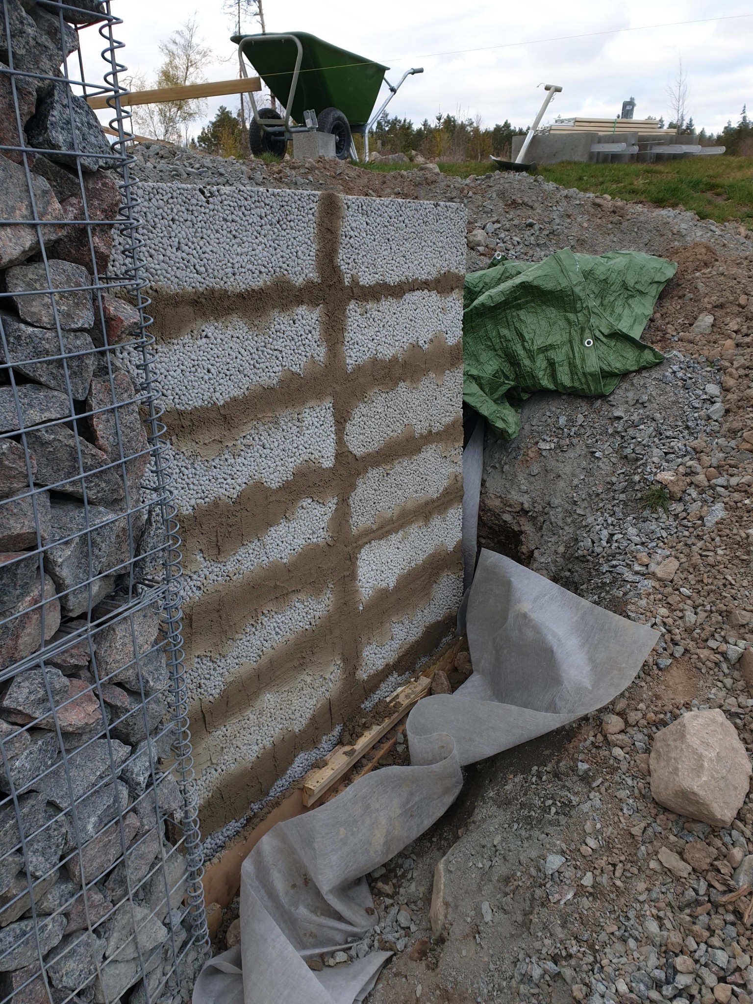 Blev en lecamur med betongfundament. Armerade i de 3 nedersta lagren och i det översta. Fyllde upp med makadam bakom.
