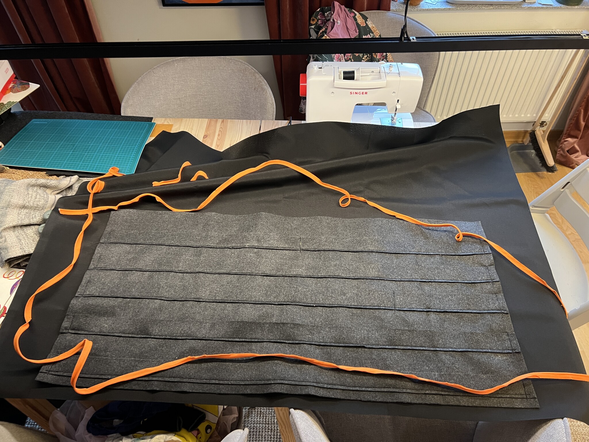 Sen skar jag ut linjalbreda (+sömsmån) remsor av filttyget som syddes dit ovanpå filtstycket som skulle bli fodret för att få som fickor till linjalerna så att de hålls på plats när man rullar ihop fodralet.