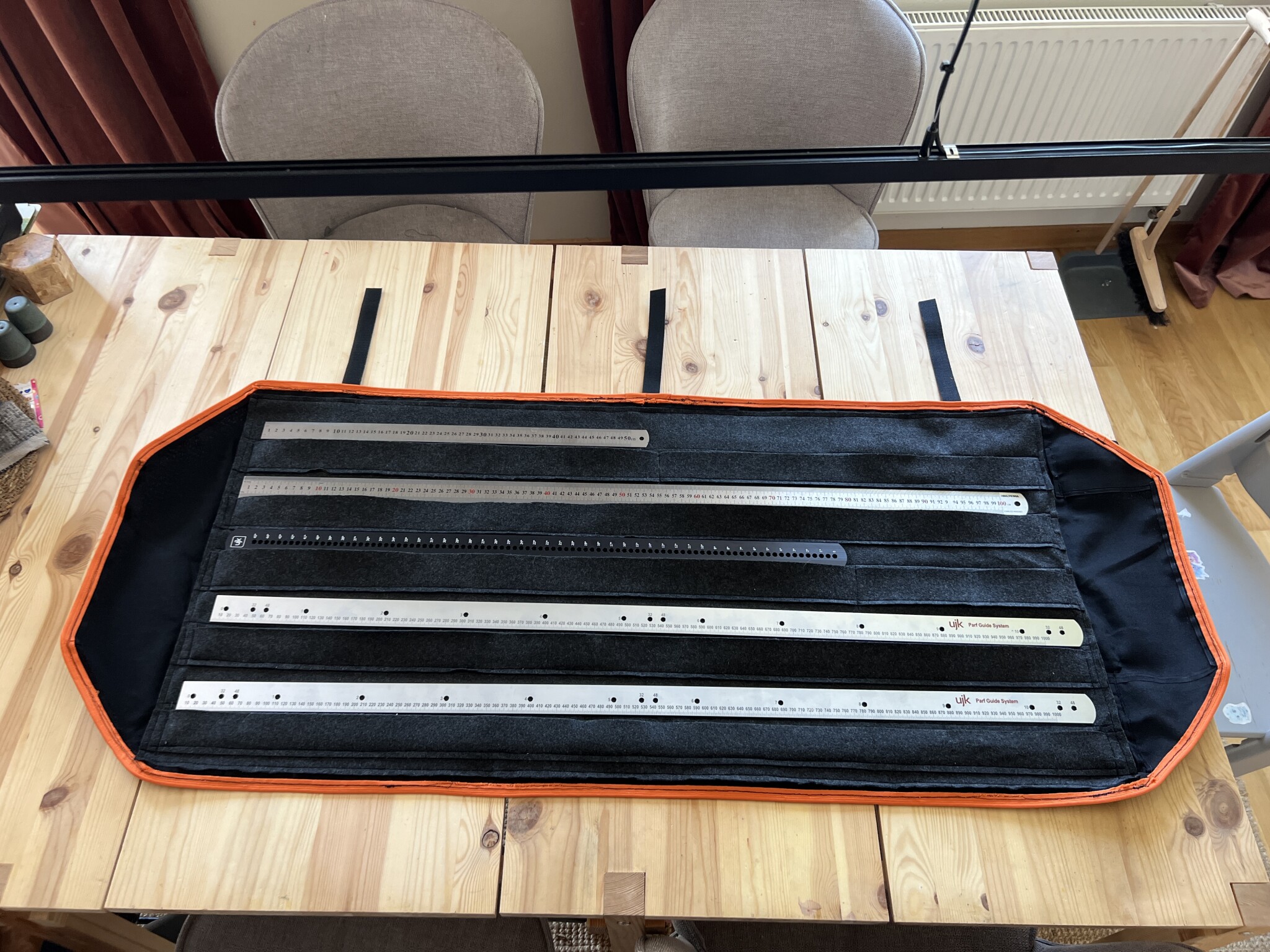 Det upprepades för alla linjalerna som skulle rymmas i fodralet. Jag har även en 1 meters stållinjal och en 50 centimeters som jag tänkte skulle få lite mer ändamålsenlig förvaring.