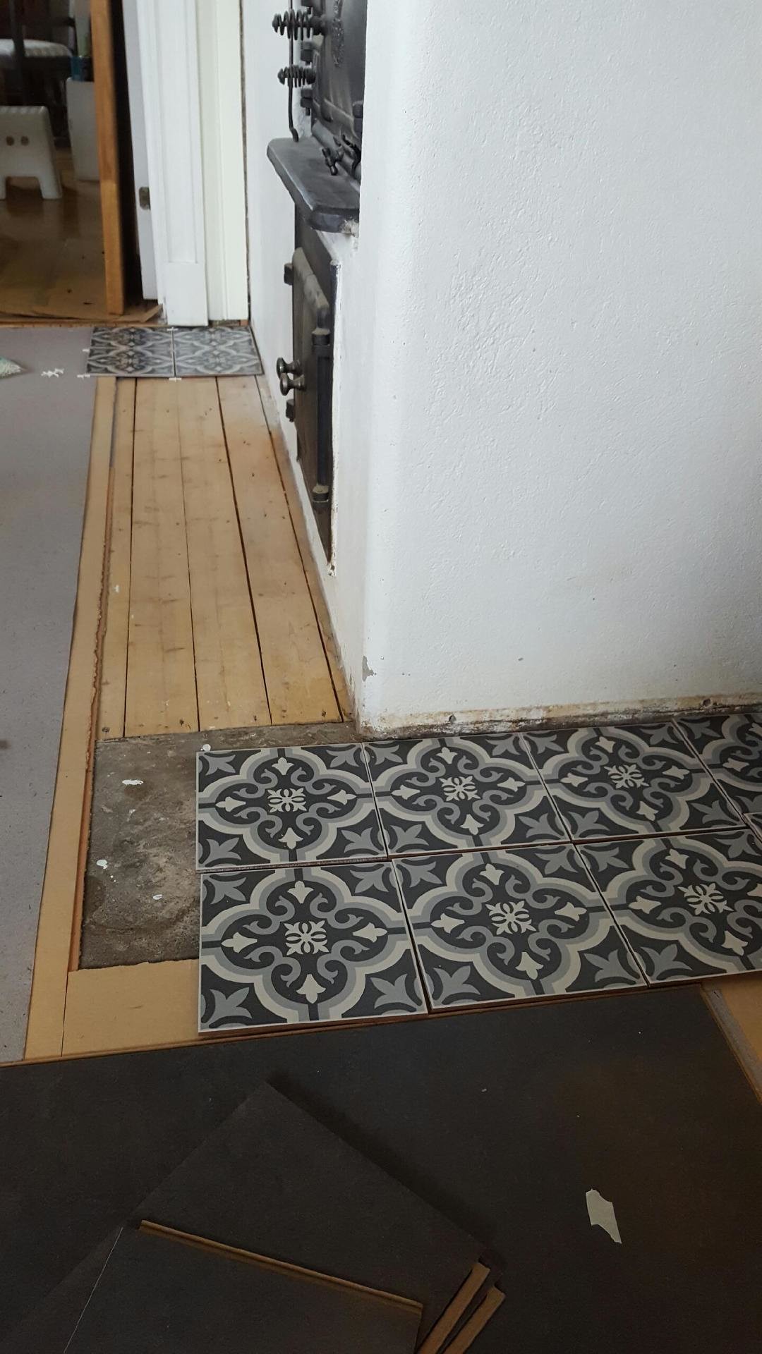 Renoverar köket och vill lägga in kakel runt vedspisen, dels för att jag tycker det är vackert, dels som gnistskydd. Underlaget där kaklet ska läggas består just nu av en liten bit betong (det har antagligen stått någon gammal järnspis där tidigare, huset är gammalt) och resten golvplankor som man fyllt ut med när köket gjorts om under tidigare renoveringar/när befintliga vedspisen byggdes. Resten av golvet är mörkgrå Marmoleum Click linoleumgolv. Kaklet ska ligga i två rader runt hela spismuren.