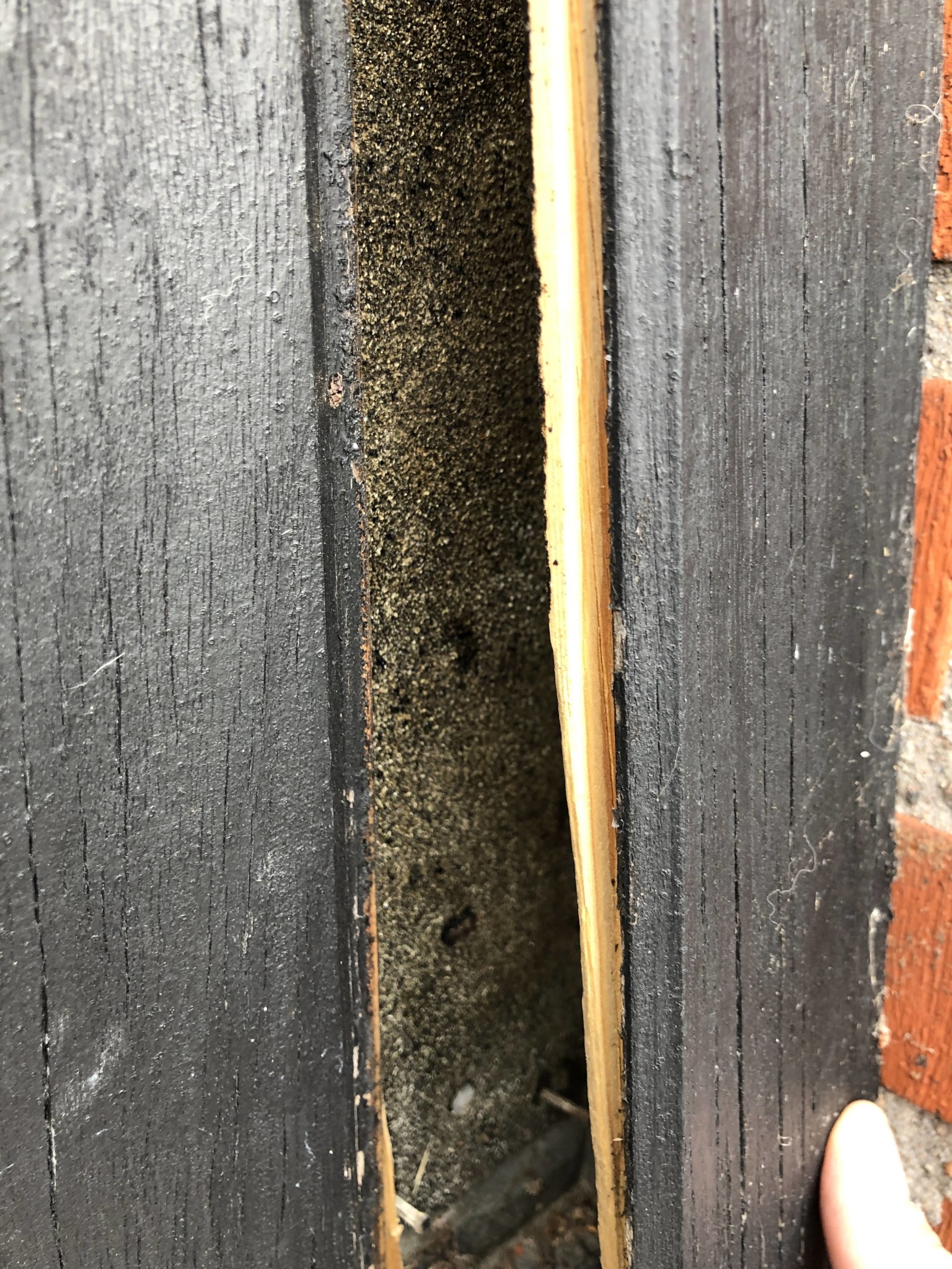 Ska byta panel imorgon hade jag tänkt. När jag lättade lite på en bräda så är det en papp av nåt slag på UTSIDAN om spikläkten istället för insidan??