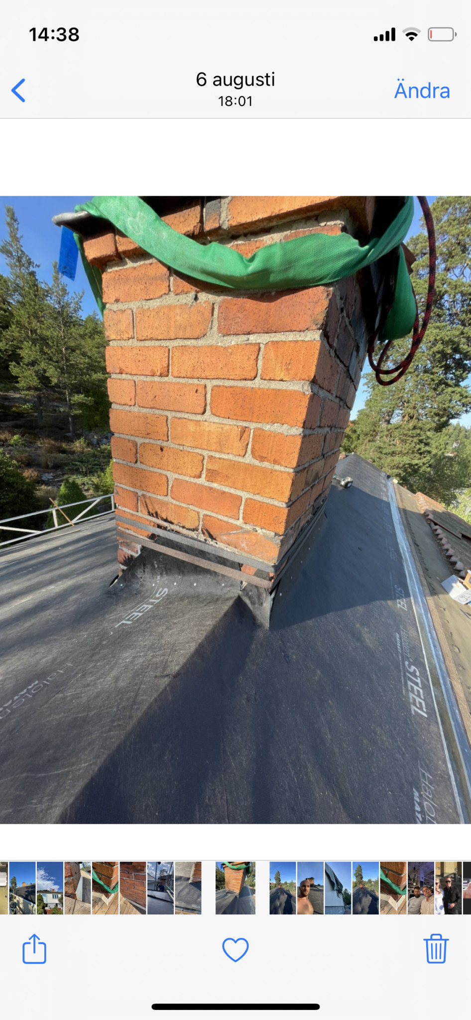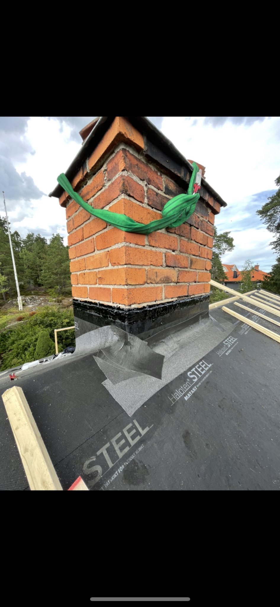 Tack, Japp ett överbläck kommer det komma. Överkurs är OK, jag jobbar ju inte direkt på timpenningJ jonaserik skrev:Inget fel i det du gjort, men kanske lite överkurs. Du måste i alla fall ha en plåtbeteckning runt skorstenen och en fog ska skraps ur lite ovanför pappanslutningen. Plåten knäcks så den går in i fogen och då kommer ev. vatten att rinna ut på plåten. En del sätter bara plåten direkt mot och vid riktigt busväder så rinner vatten in bakom plåten/omfattningen.
