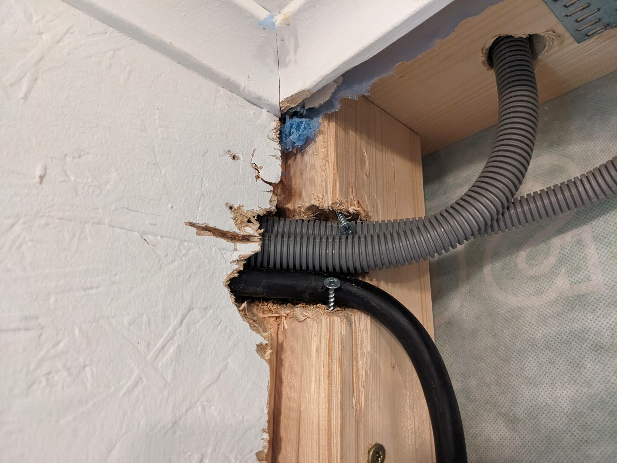Hade en elektriker hemma som installerade undercentral och laddbox till bilen i garaget, och jag ställer mig lite tveksam till om installationen blev fackmannamässigt utförd. Förutom att trasa sönder väggen en del i onödan så har han fixerat flexrör och matningskabeln till centralen med två gipsskruvar. Det tänker jag fixa innan jag stänger igen väggen, men det som oroar mig är att matningskabeln (som går från centralen på huset till undercentralen) är fäst i regeln utan något spikskydd.