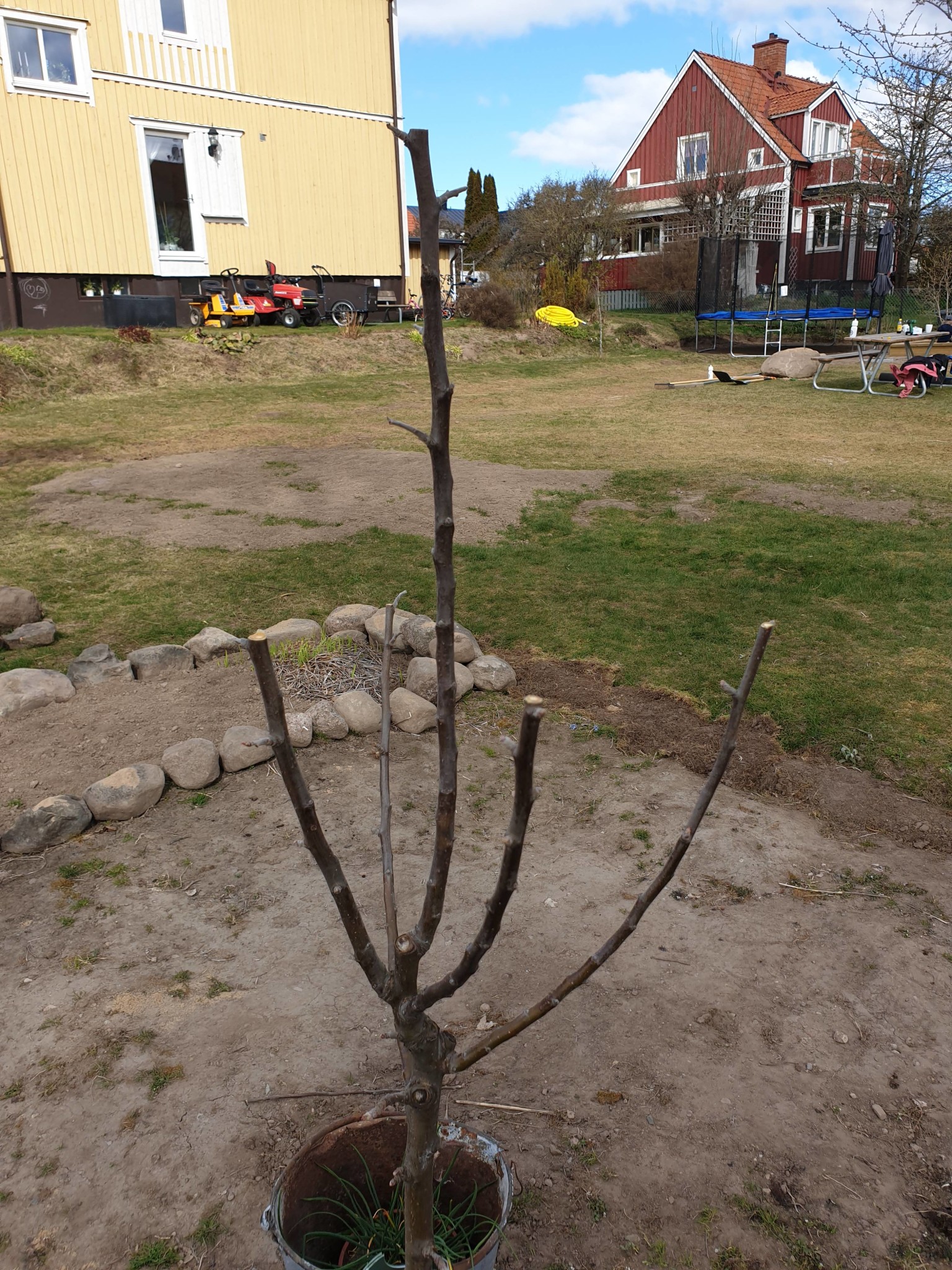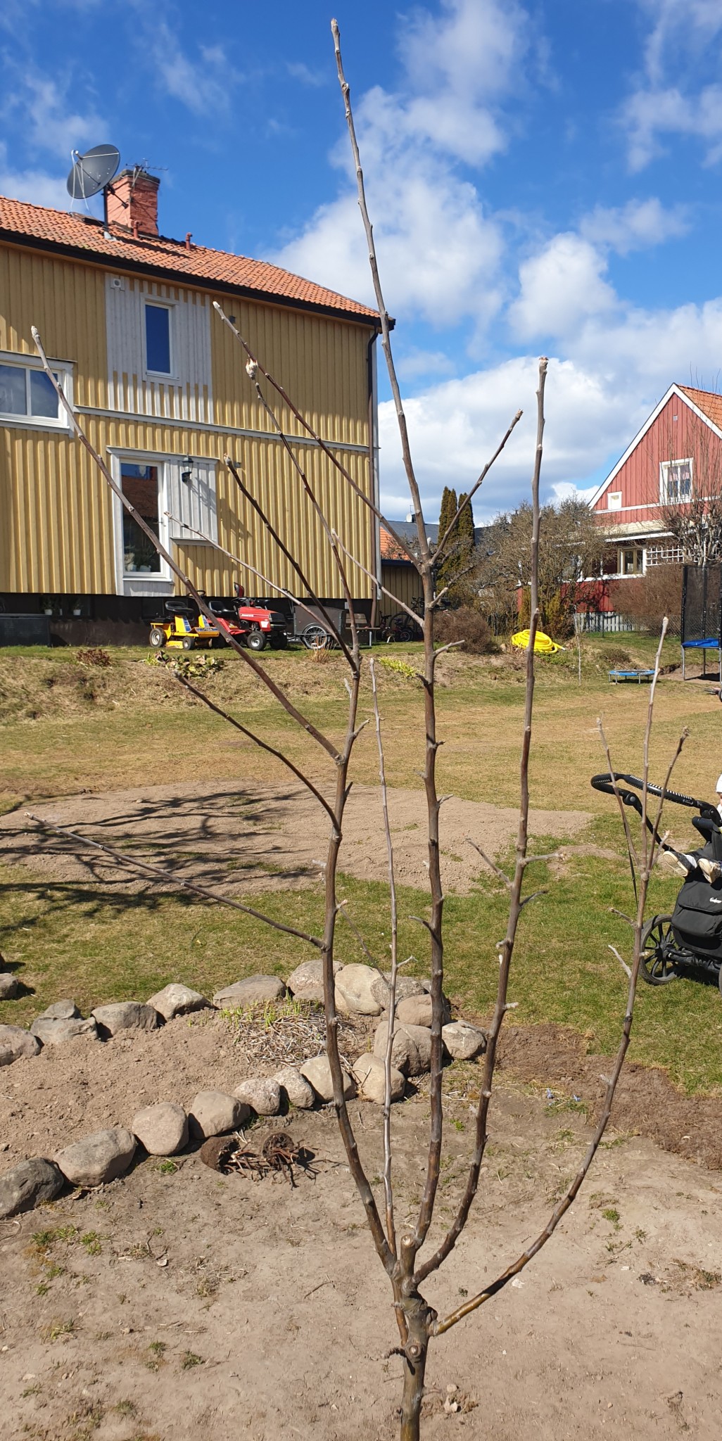 Har försökt mig på att uppbyggnadsbeskära ett ungt äppelträd. Men är osäker på en gren, räknas denna som konkurrerande toppskott eller räknas den som gren (se bild)? Den har väldigt snäv grenvinkel, så tänkte att jag isf skulle försöka binda ner den lite försiktigt så den får en chans att förveda(?) sig i en mindre snäv vinkel om den ska få vara kvar vill säga.