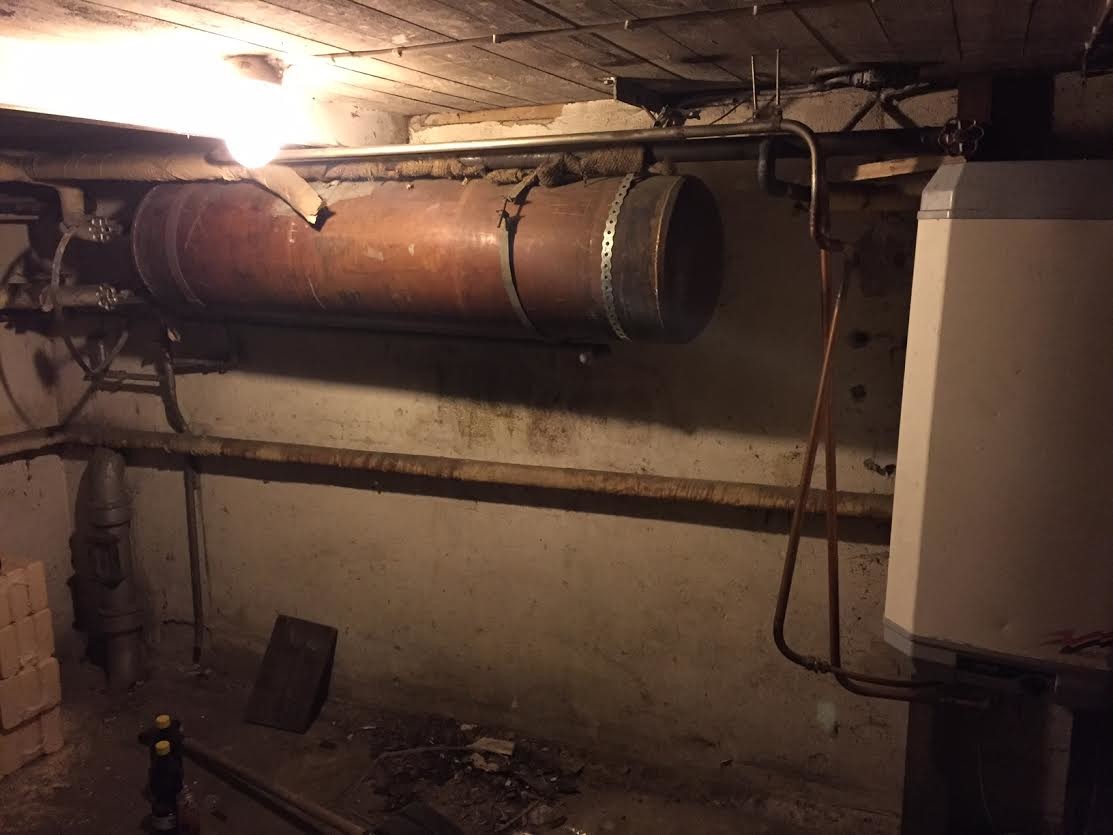 - Skorsten på uppskattningsvis 20 meters höjd från pannan, 5 kanaler varav en kanal är större, tror både oljepannan och vedpannan går på den större. De övriga fyra lär vara fördelade på vedspis i köket, öppenspis i vardagsrum och en till ventilation ovanför vedspisen i köket där jag även tror avluftning av avlopp är kopplad på.