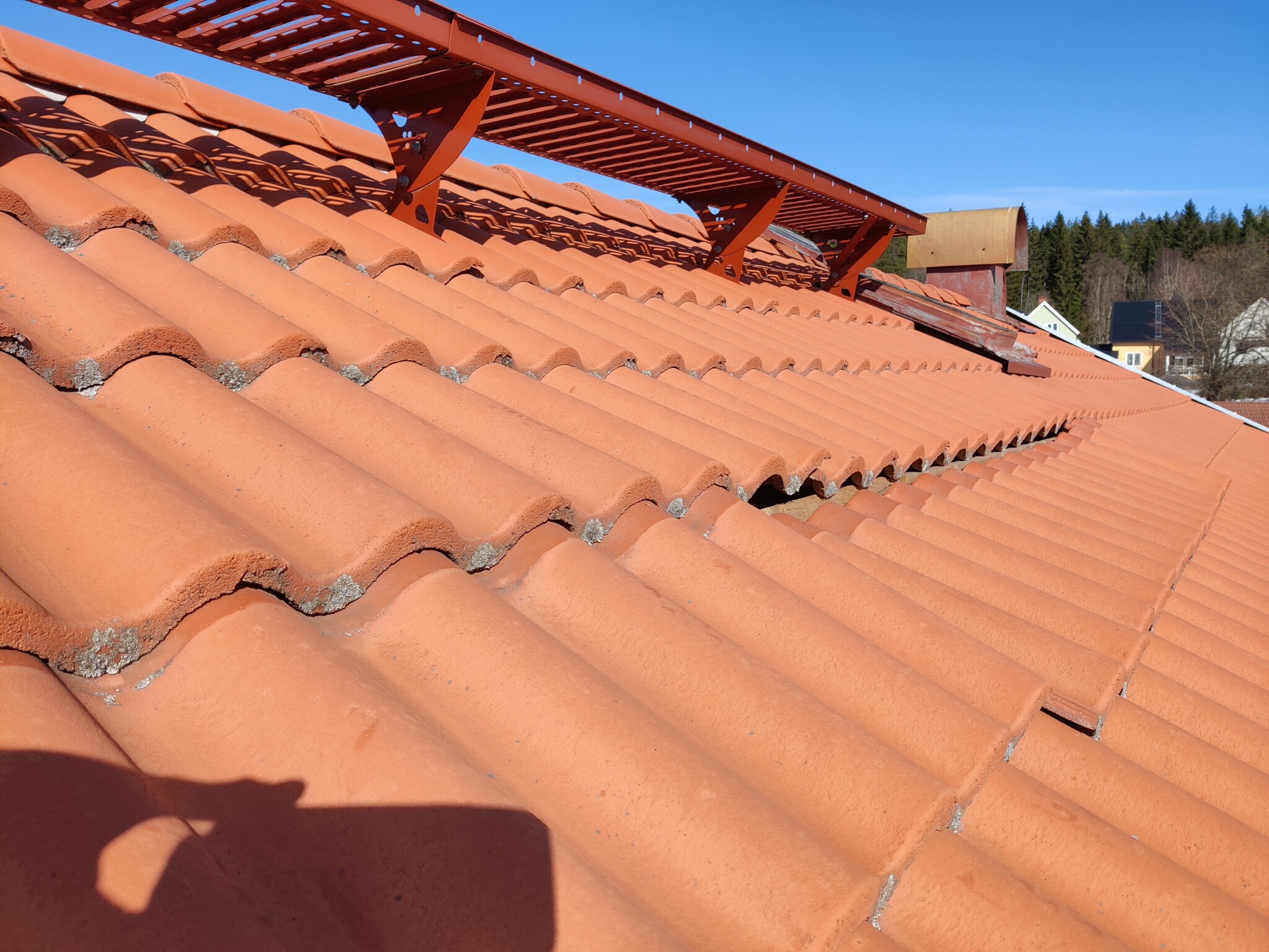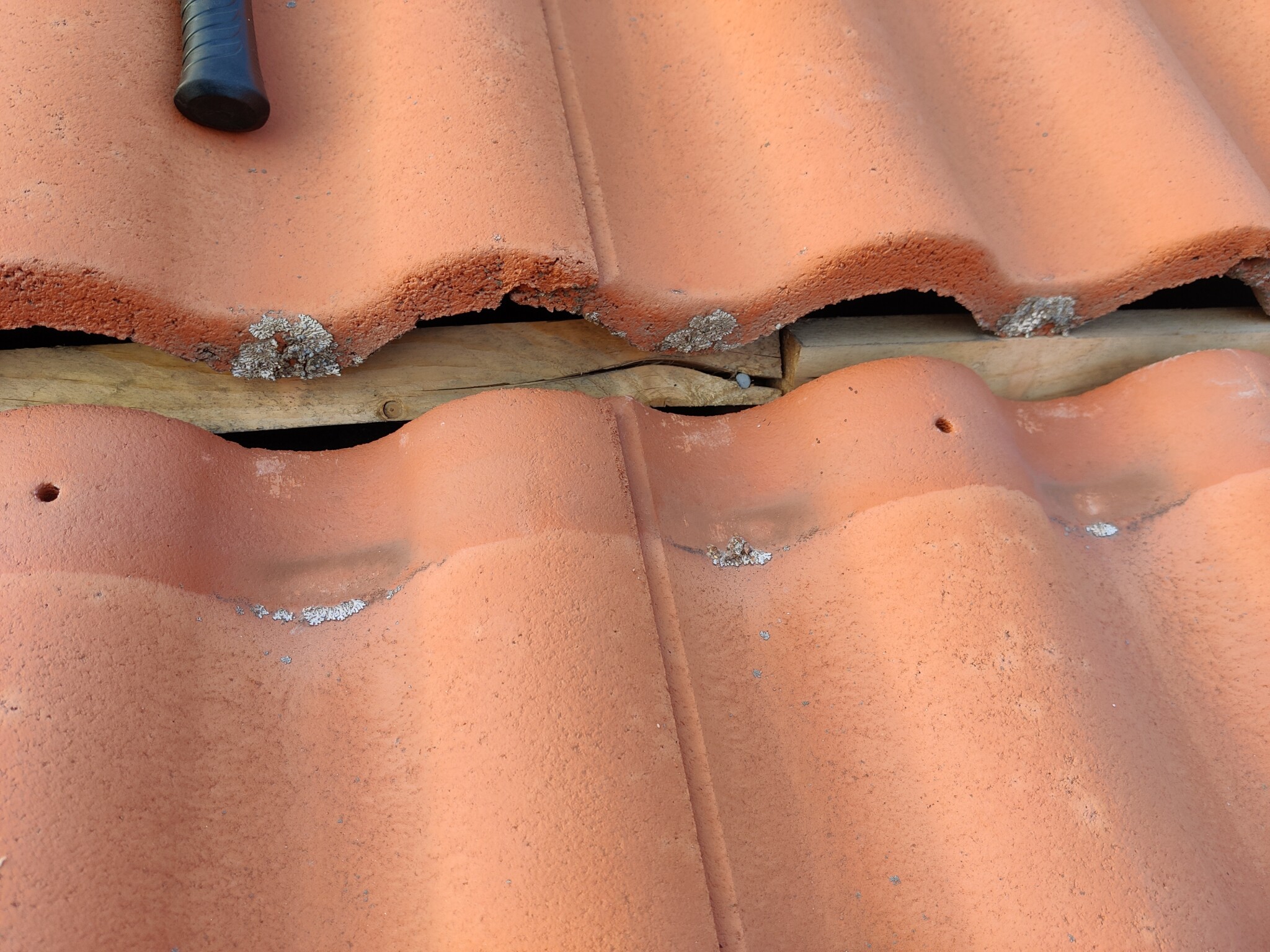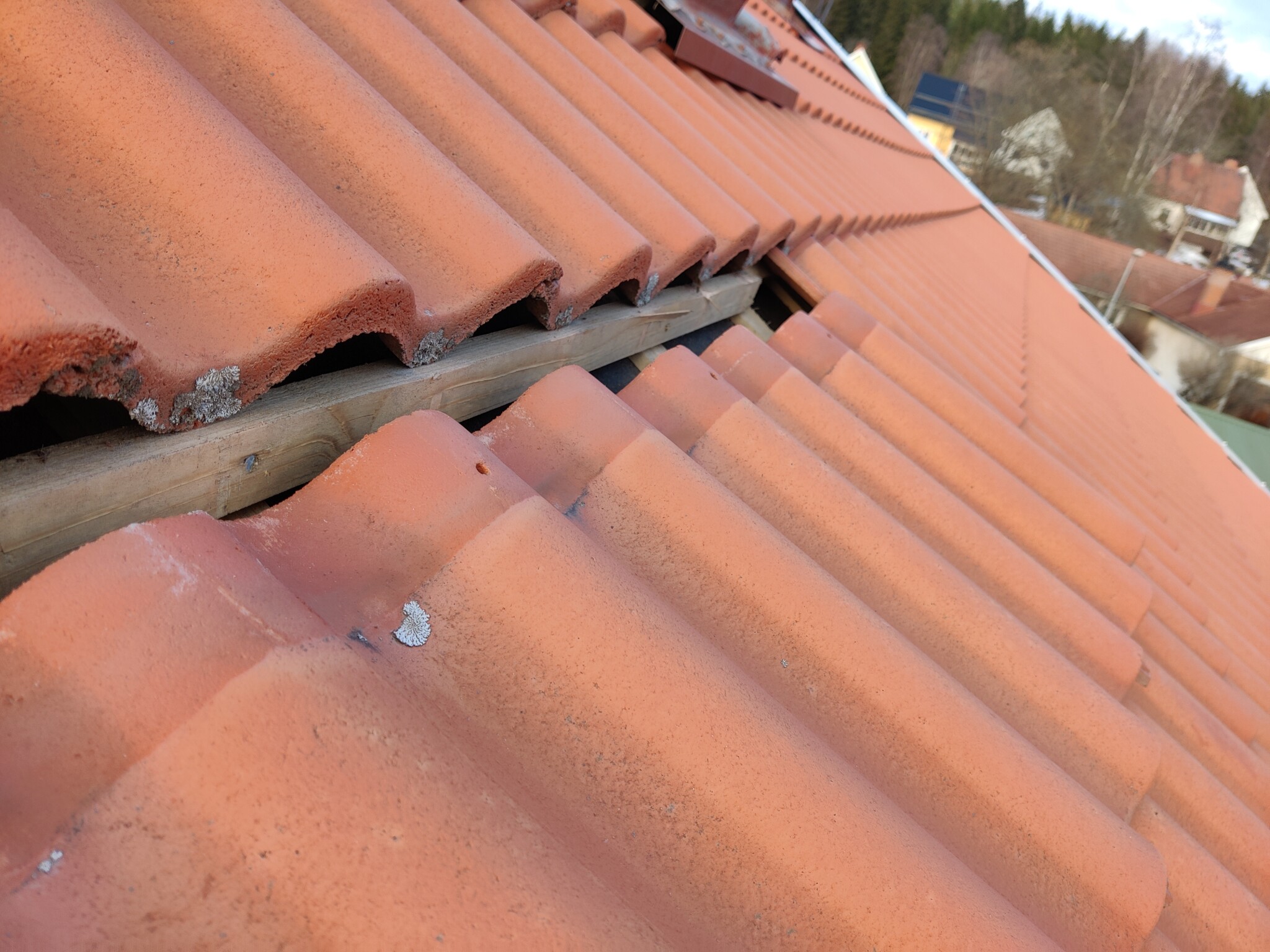Igår upptäckte jag att det har uppstått en drygt två meter lång glipa mellan två rader betongpannor i mitt tak som byttes hösten 2014. Bärläkten under har fläkts/tryckts upp så att pannorna helt enkelt har glidit av, men pannorna ser oskadda ut (se bilder)