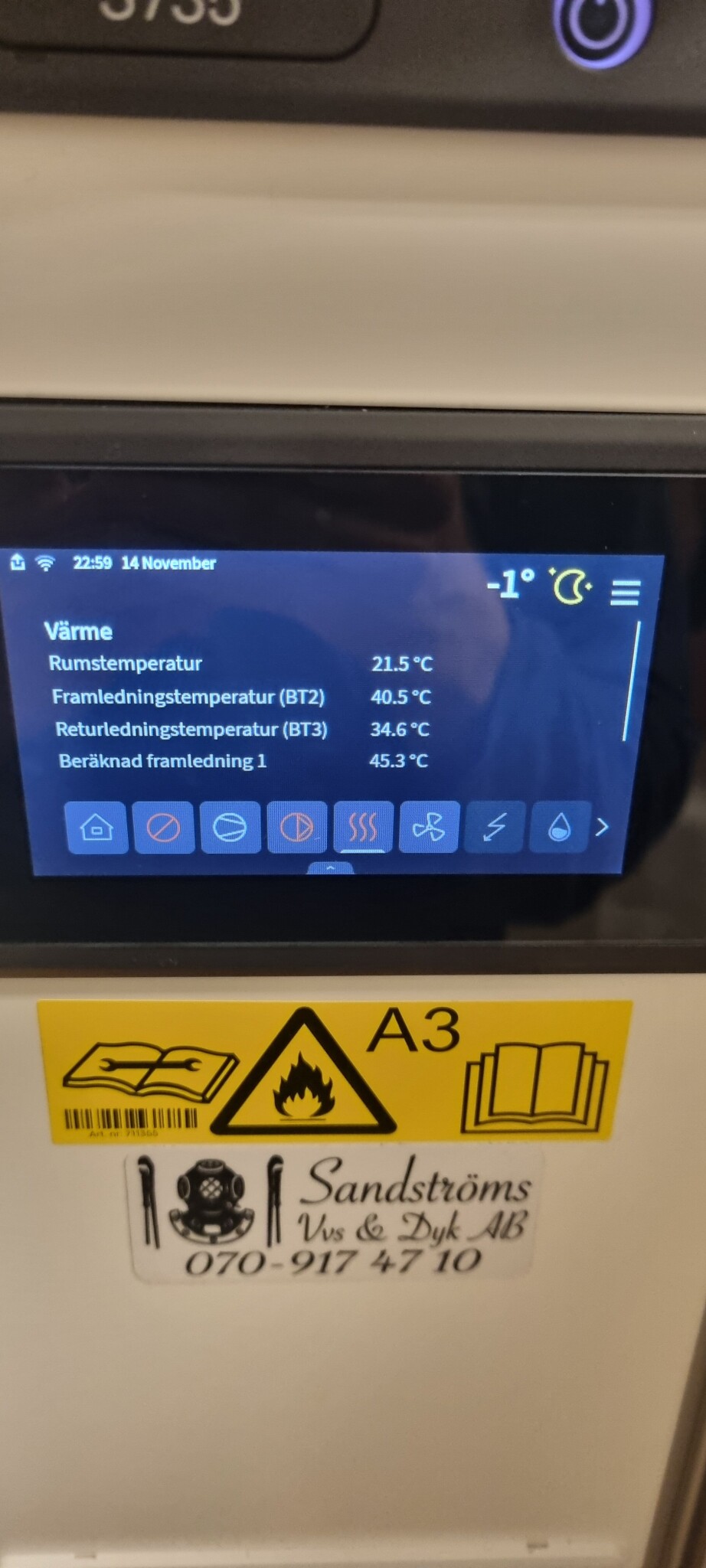 Igår var den kallaste dagen i höst och problemet med uppvärmningen var mest uppenbart. När jag kom hem från jobbet igår runt 16:15 var rumstemperaturen 22,4 grader (behövs 20 grader), och utetemperaturen var +1 grad och elementen var helt kalla. Vid den tidpunkten visade värmepumpen att den var i värmeläge och kompressorn arbetade på 25 Hz Redan klockan 19 var rumstemperaturen 21,2 grader och huset kändes kallt och dragigt från ventilationen. Efter klockan 19 började värmepumpen värma och kompressorn arbetade större delen av tiden på en maxhastighet på 95 Hz. Fram till klockan 23 värmdes elementen då och då upp lite (utetemperatur -1 grad), men inte för mycket, och sedan svalnade de helt igen, och rumstemperaturen steg till 21,6 grader. Kompressorn tinade upp flera gånger från klockan 19 till 23, och en gång klockan 20:50 och först efter 30 minuter återigen klockan 21:20 (avfrostningarna var vanligtvis cirka 7-8 minuter). Under hela perioden från klockan 19 till 23 märkte jag inte att cirkulationspumpen gick på en hastighet högre än 51%, trots att det är kallt hemma. Under kompressorns avfrostning var cirkulationspumpens hastighet 25 %. Först idag när jag gick upp runt klockan 9:30 var elementen mycket varma och rumstemperaturen var 22,4 grader. Under natten gick även elpatronen på i cirka 40 minuter. Från klockan 00:00 till 21:30 förbrukade pumpen 16,2 kW, vilket jag tycker är mycket för ett hus med solid isolering.Nu är jag intresserad av vad problemet är och varför värmepumpen beter sig så här. Jag har några frågor, så om någon kunde svara på dem vore det bra.1. Varför arbetar inte cirkulationspumpen på hög hastighet när rumstemperaturen är lägre än 22 grader, för att överföra värmen som produceras av pumpen till radiatorerna?För mig är det mycket mer logiskt att till exempel cirkulationspumpen arbetar på hög hastighet i natt, och att kompressorn arbetar på någon normal hastighet. Detta skulle minska antalet kompressoravfrostningar och minska elförbrukningen.