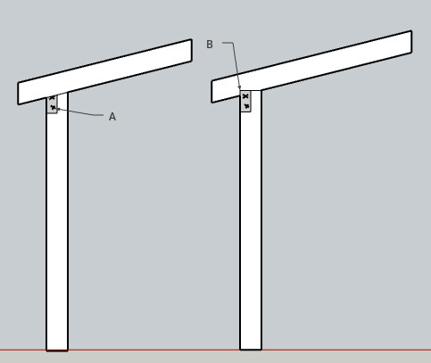 Alternativ A ger fördelen för perglola att vattnet inte blir stående på balken och stolpen. Dock blir det ju en kraft som går inåt på stolparna och inte rakt ner. Tänker speciellt om jag lägger på takplast i framtiden så det kan bli lite tyngd. Taket lutar ca. 10 grader.