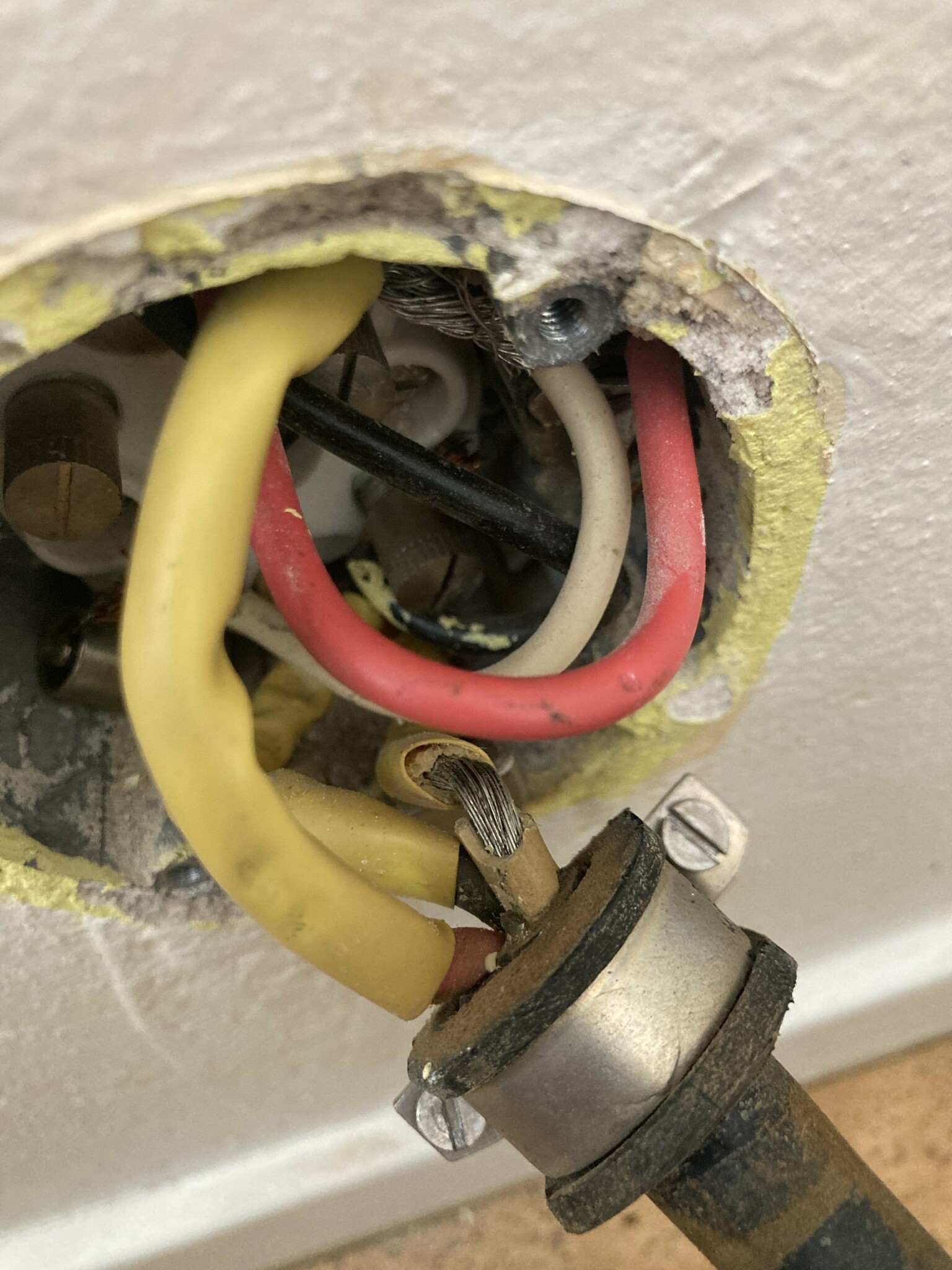 Det där ser riktigt illa ut! Sprucken kabelisolering som kan vara fas... Ta dit en elektriker innan du sätter på strömmen igen.
