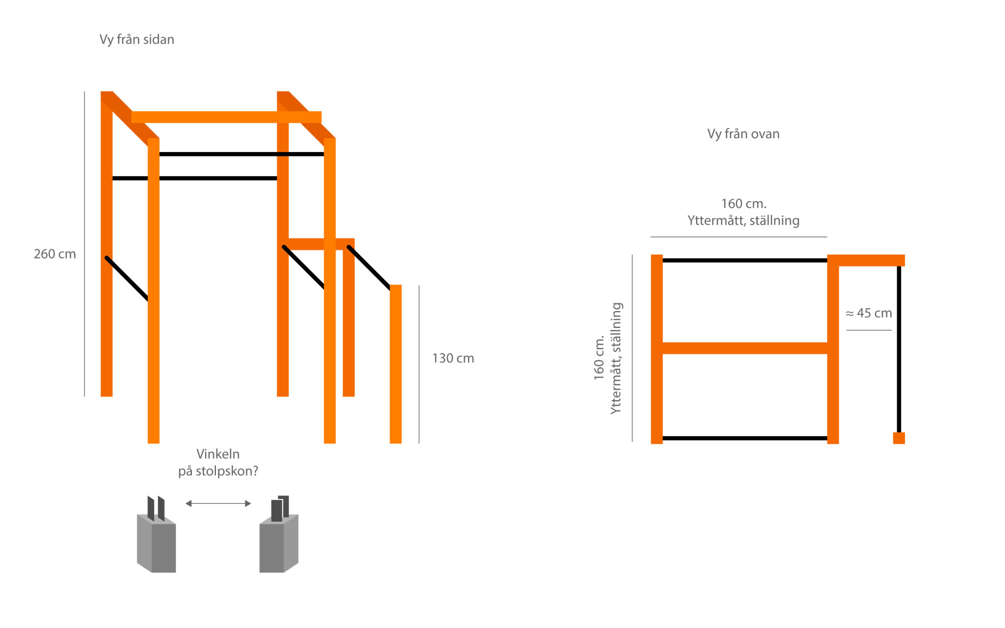 Jag vill bygga en ställning för utomhusträning för mig (100kg, 96cm), och lek för mina barn. Skissen är följande.
