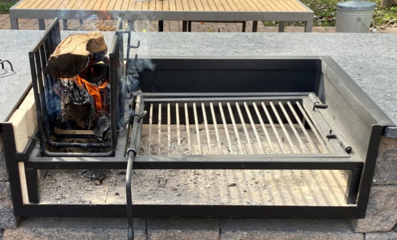 Tanken är grill, arbetsyta och en ho med sommarvatten. Tak över det hela eftersom vi grillar året runt. Ursprungligen var tanken att bygga in en Weber klotgrill i bänkskivan men det är ju så tråkigt. Jag har tittat på de smidda grillarna som finns i Sydamerika. Eldnings korg på sidan och den glödande kolen skrapas till sidan under grill gallret. Gallret kan vinklas för att justera tempen.