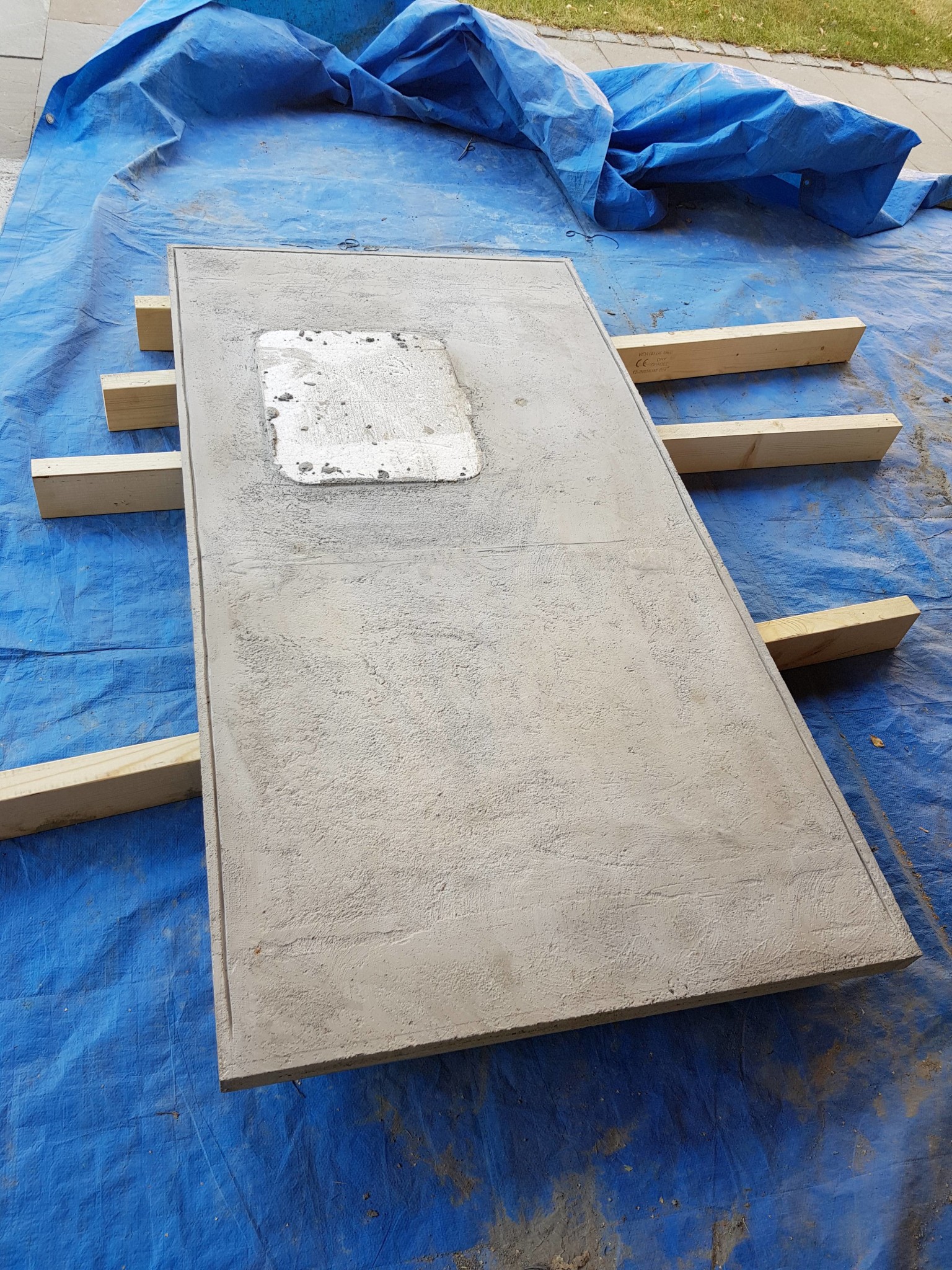 Bygga form och gjuta en liten sockel ovanpå, visst, men vi ska sätta skivan ikväll, och min erfarenhet säger att helt plant är ändå svårt att få det, precis som gjutna skivan inte blev helt perfekt plan på ovansidan (det som blir undersidan när man vänder upp den).
