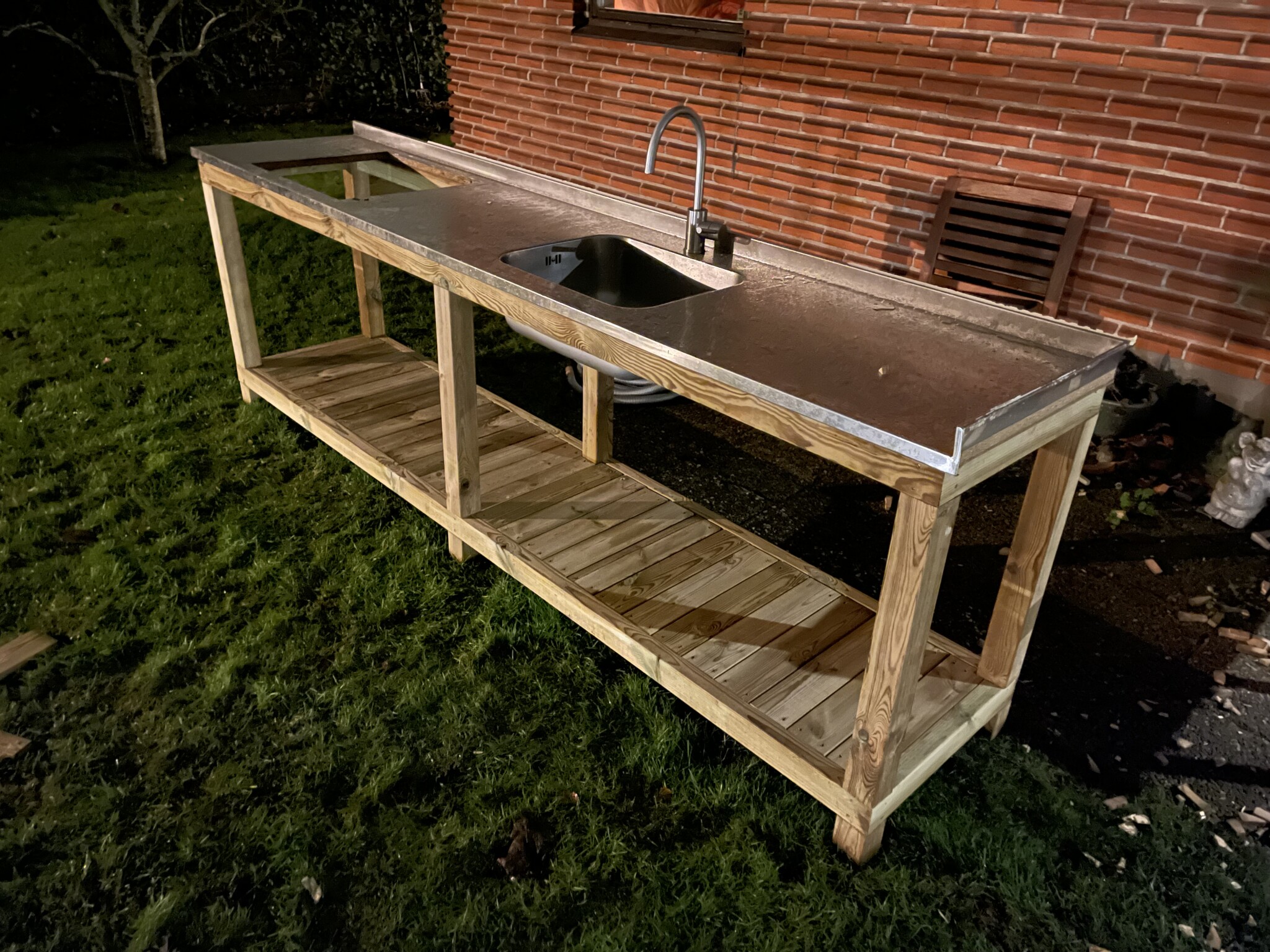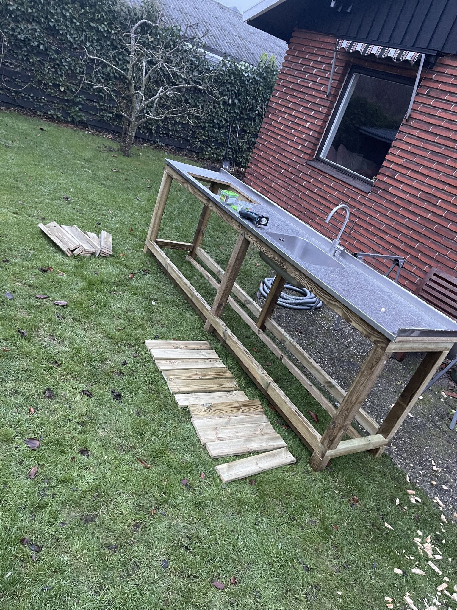 Jag ska faktiskt göra en liknande bänk igen om någon vecka. Jag kommer göra ungefär likadant men välja 95x95 stolpar och 95x45 reglar då och sen inte ha några stolpar i mitten då den rostfria bänkskivan är 240 cm. Den här är runt 3 meter tror jag.